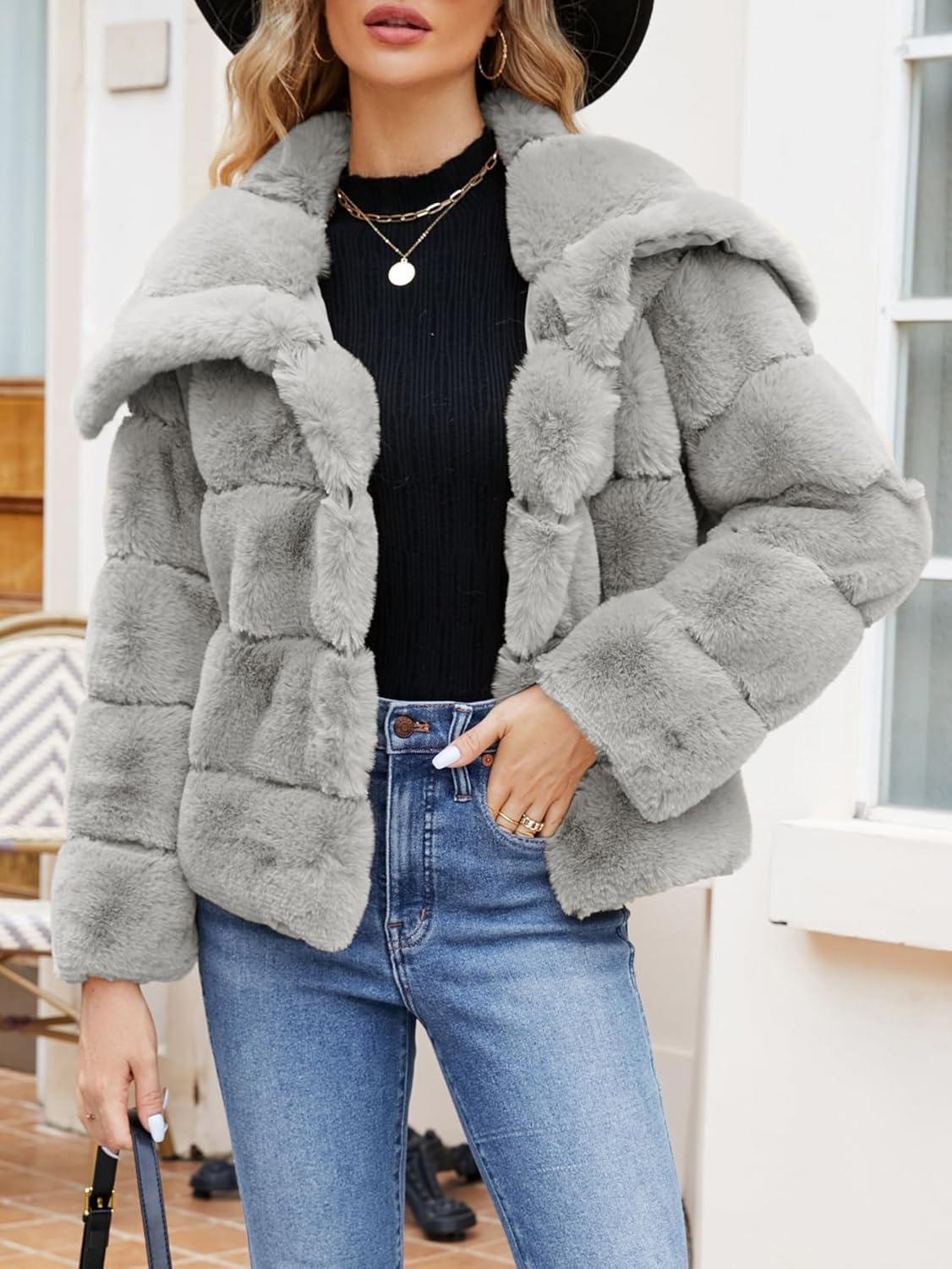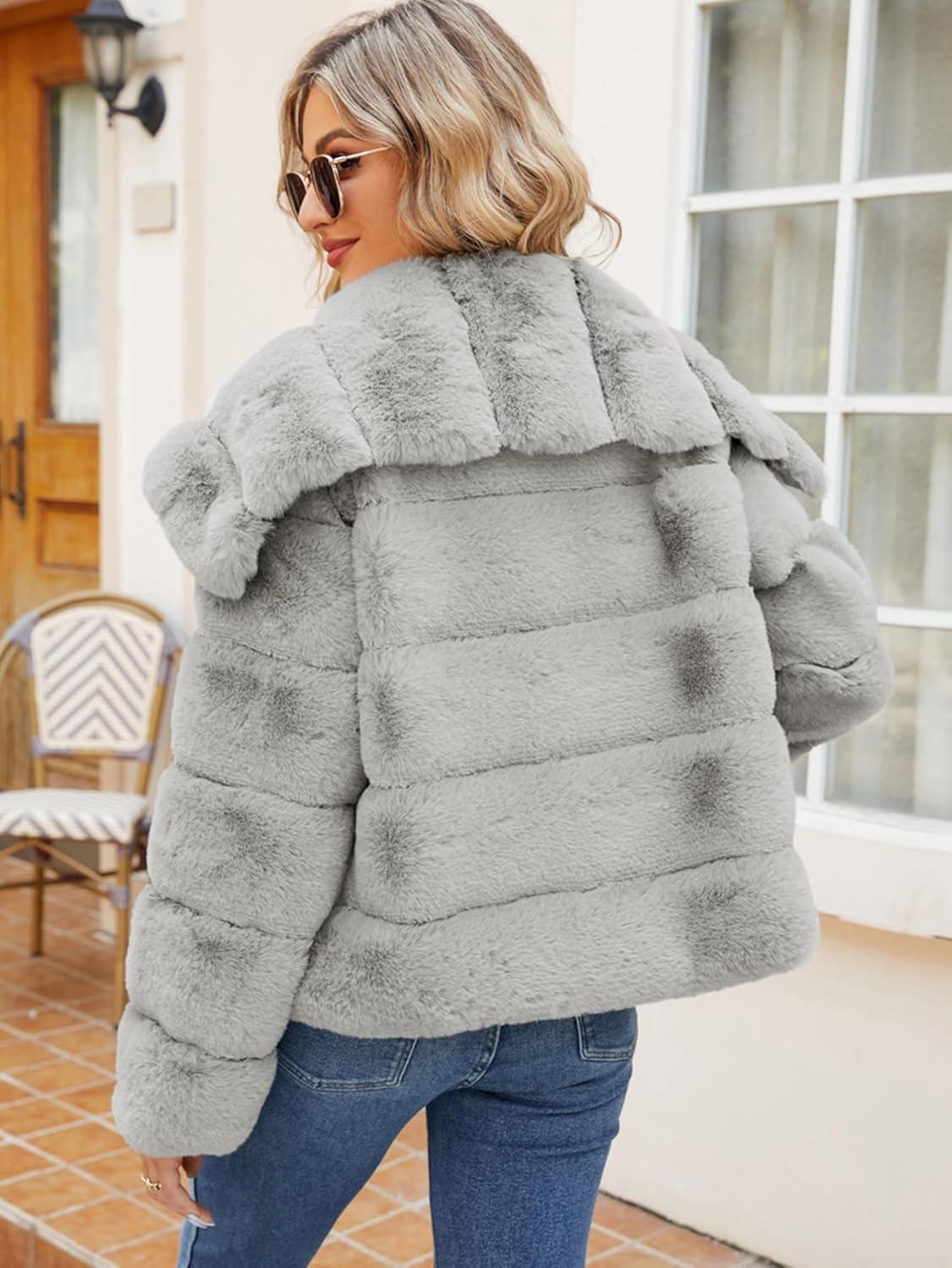 Simplee Apparel Womens Faux Fur Coat Fleece Cropped Jacket Long Sleeve Fur Coats Warm Winter Jackets 2025(Grey)