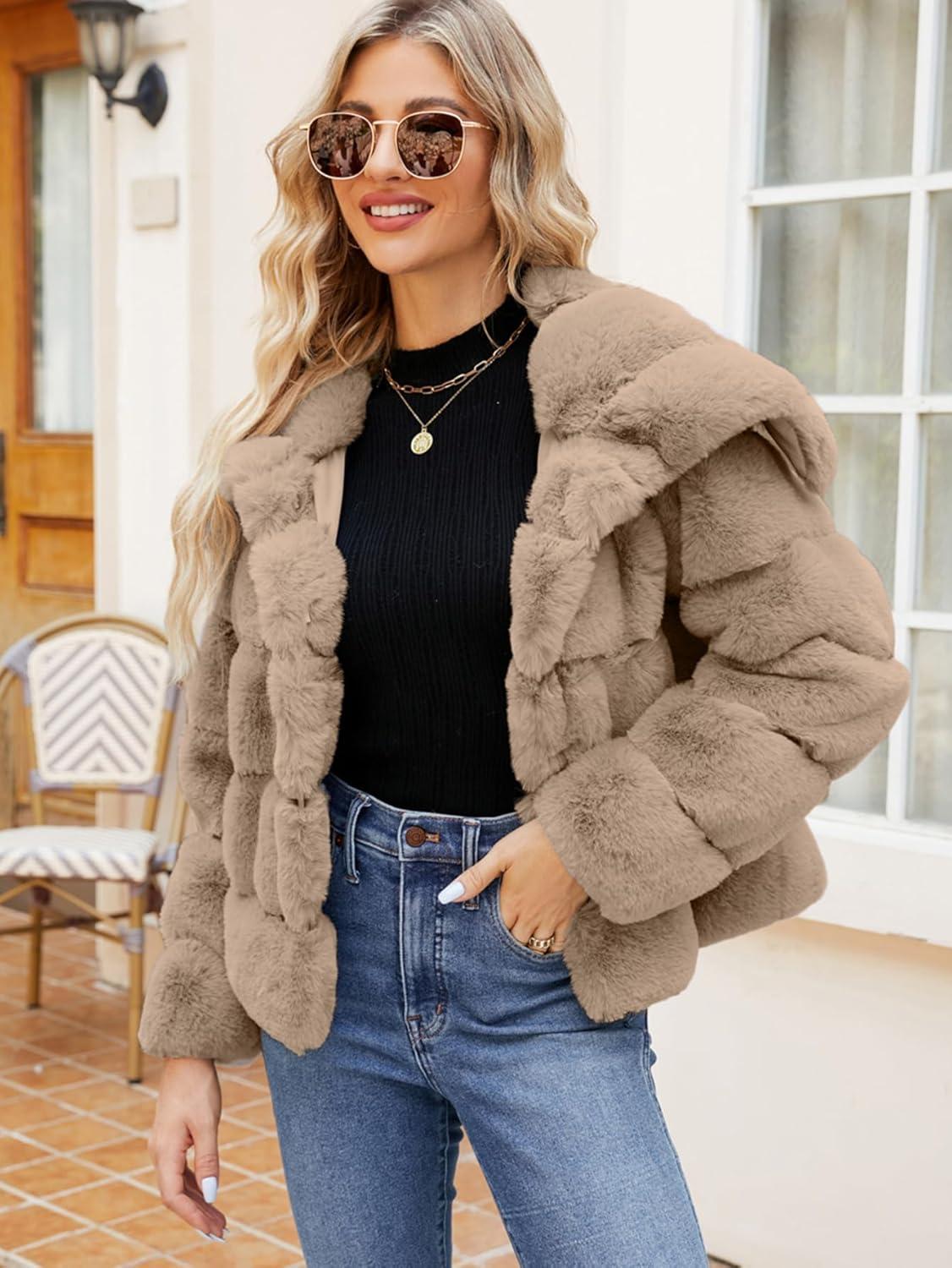 Simplee Apparel Womens Faux Fur Coat Fleece Cropped Jacket Long Sleeve Fur Coats Warm Winter Jackets 2025(Light Khaki)