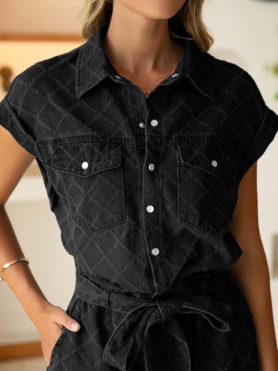 Simplee Womens 2025 Denim Romper Casual Short Sleeve Cargo Jean Romper Overall Shorts With Pockets(Black)