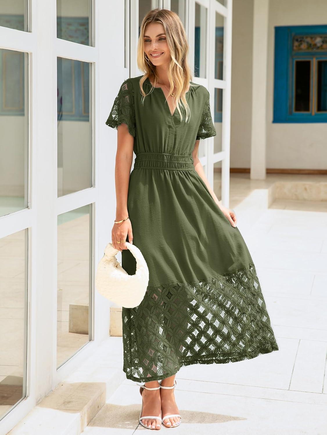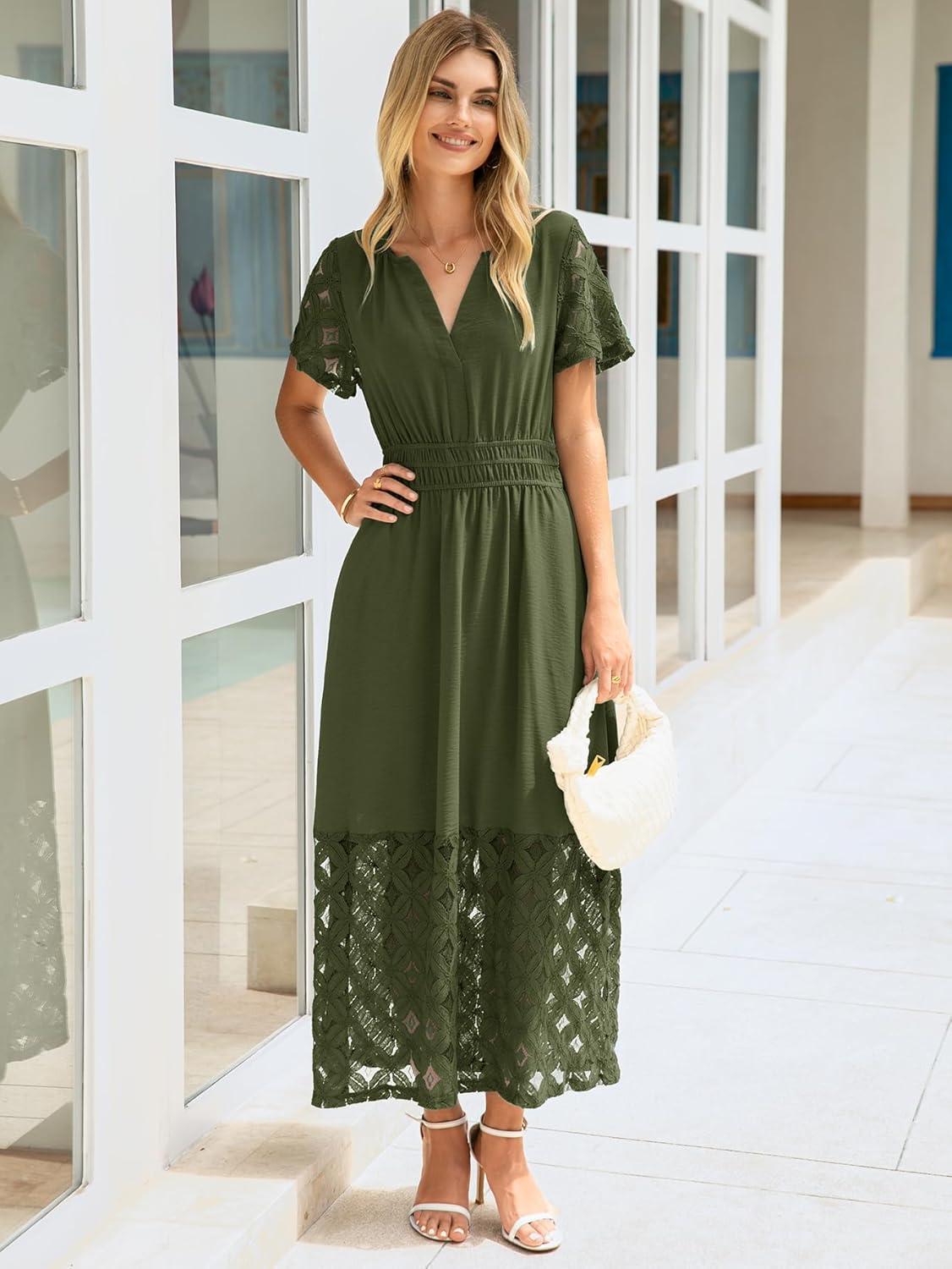 Simplee Womens 2025 Summer Boho Maxi Dress V Neck Empire Waist Long Flowy Dresses with Pockets(Army Green)