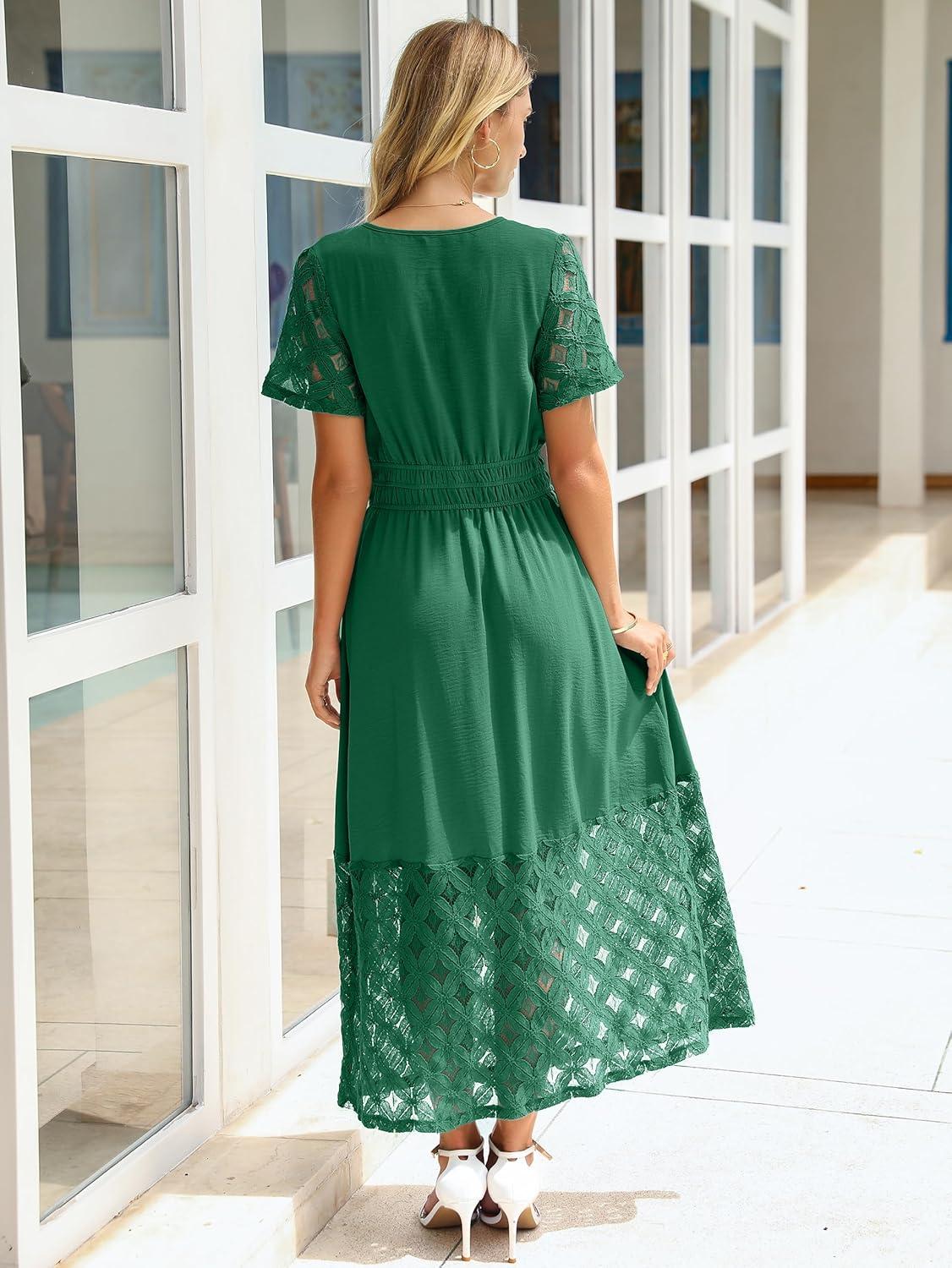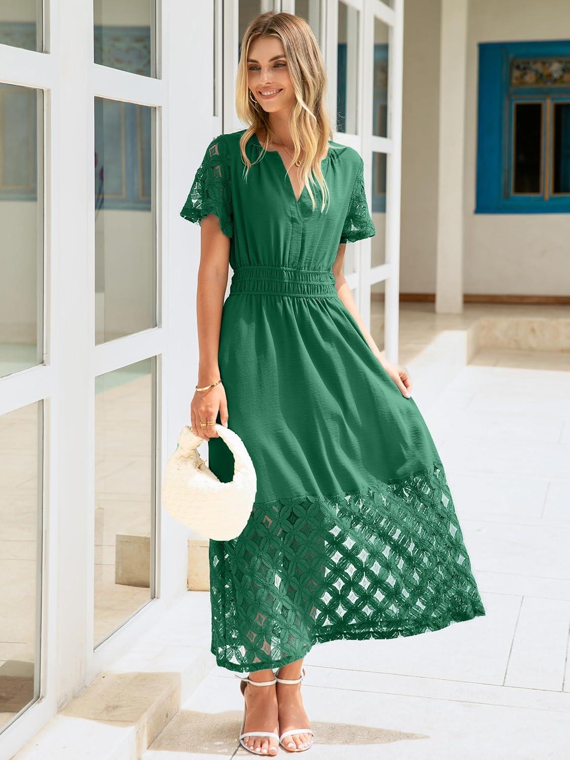 Simplee Womens 2025 Summer Boho Maxi Dress V Neck Empire Waist Long Flowy Dresses with Pockets(Emerald Green)