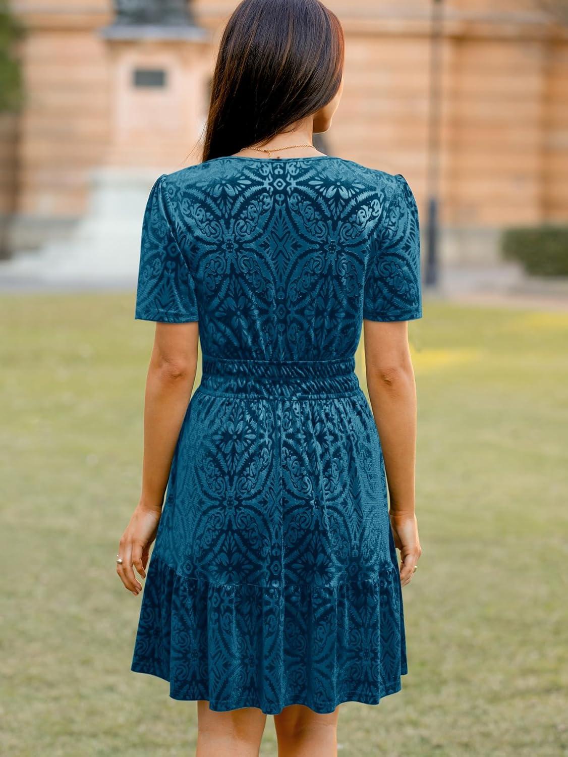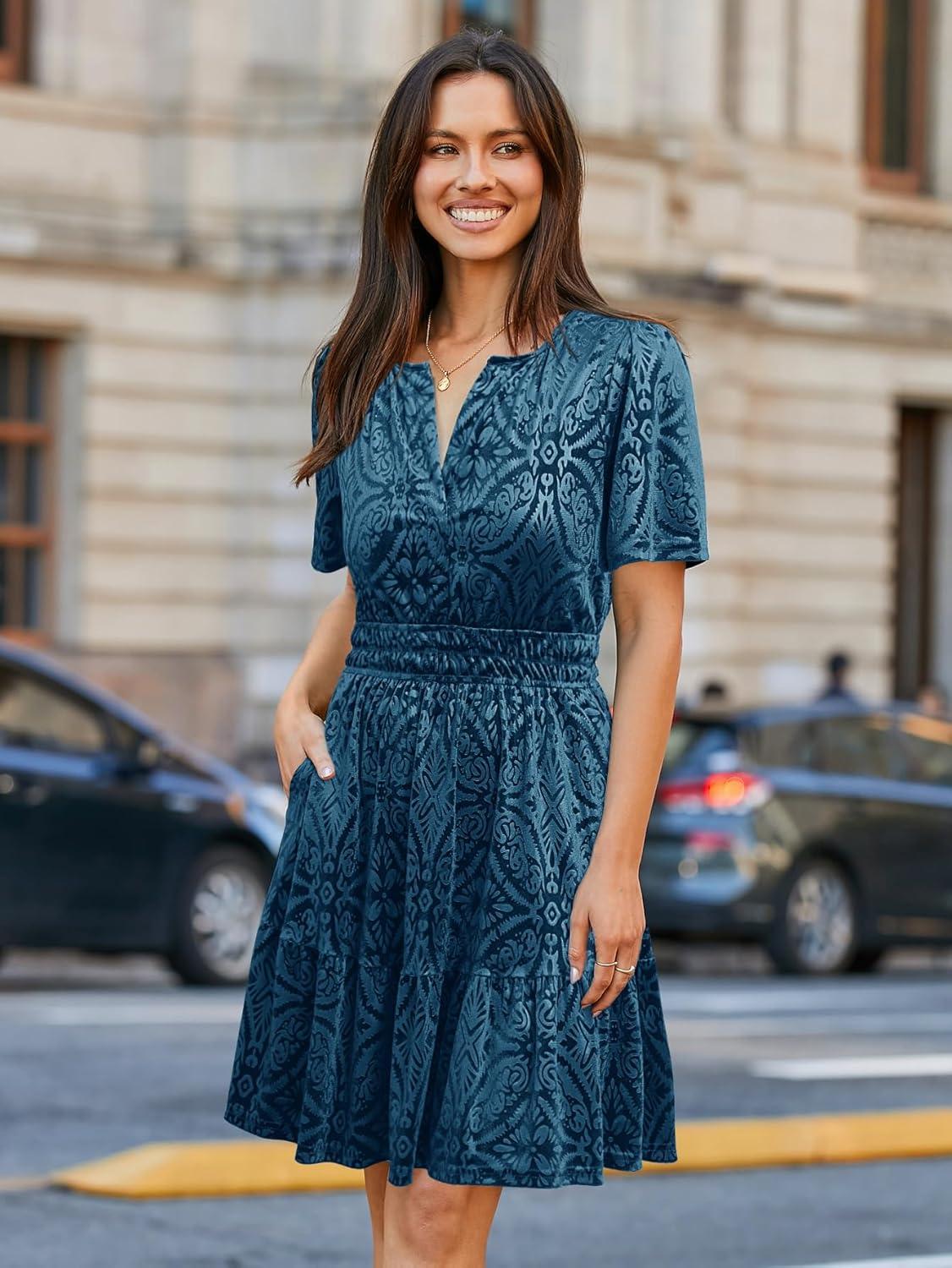 Simplee Women’s 2025 Velvet Short Sleeve Cocktail Dress Fall Winter Casual V Neck Empire Waist Mini Dresses with Pockets(2-burnout Dark Blue)