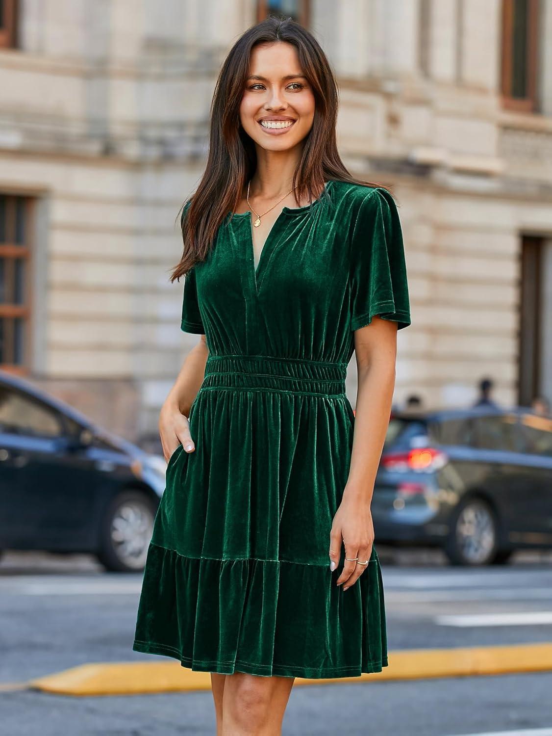 Simplee Women's 2025 Velvet Short Sleeve Cocktail Dress Fall Winter Casual V Neck Empire Waist Mini Dresses with Pockets(#Green)