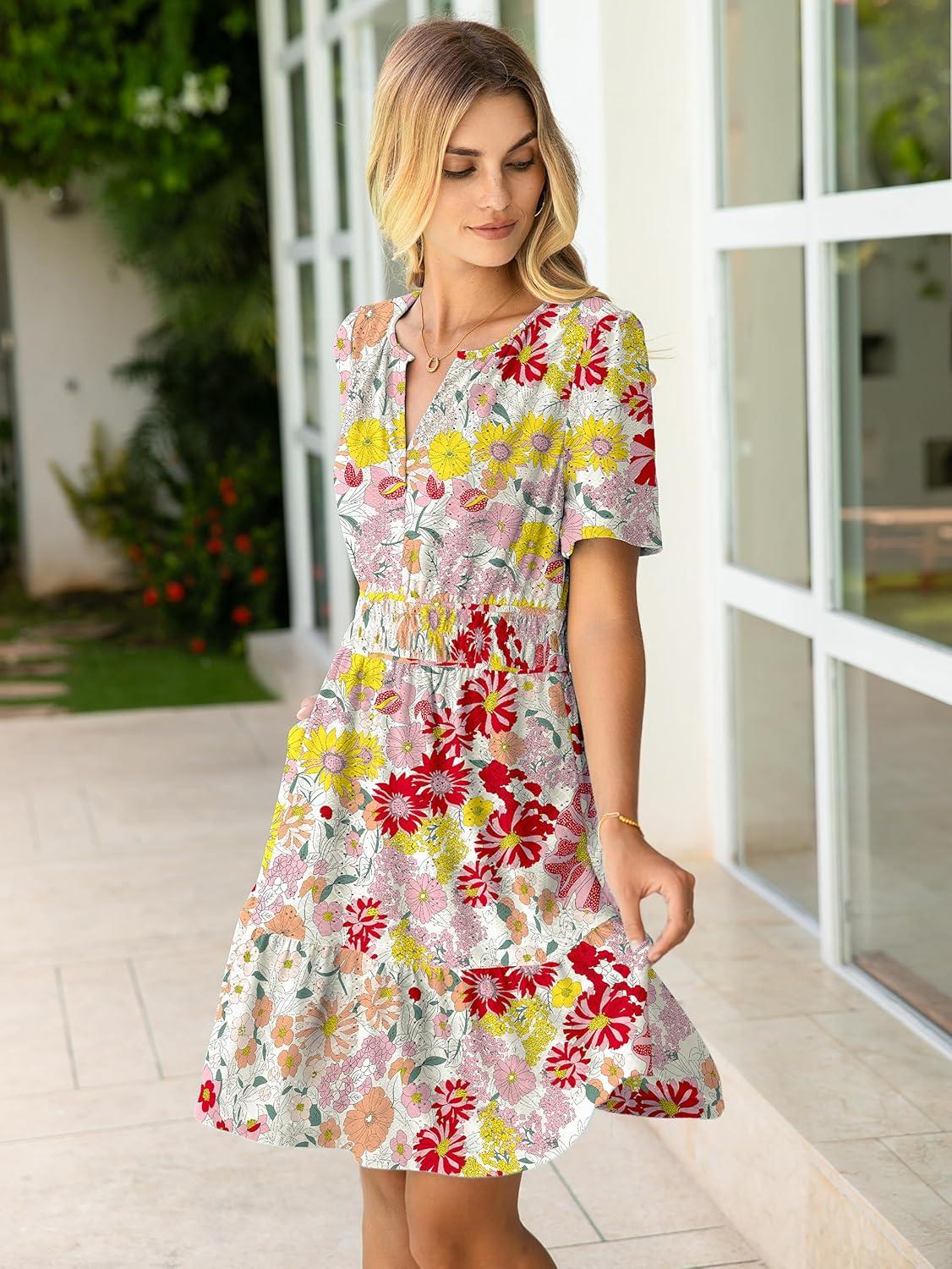 Simplee Womens 2026 Summer Mini Dress Eyelet Short Sleeve Cocktail Short Dresses Cute A Line Sun Dress with Pockets(Pink Floral)