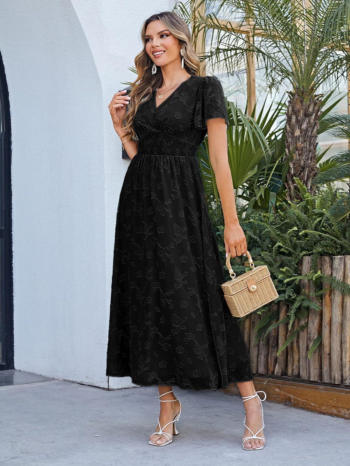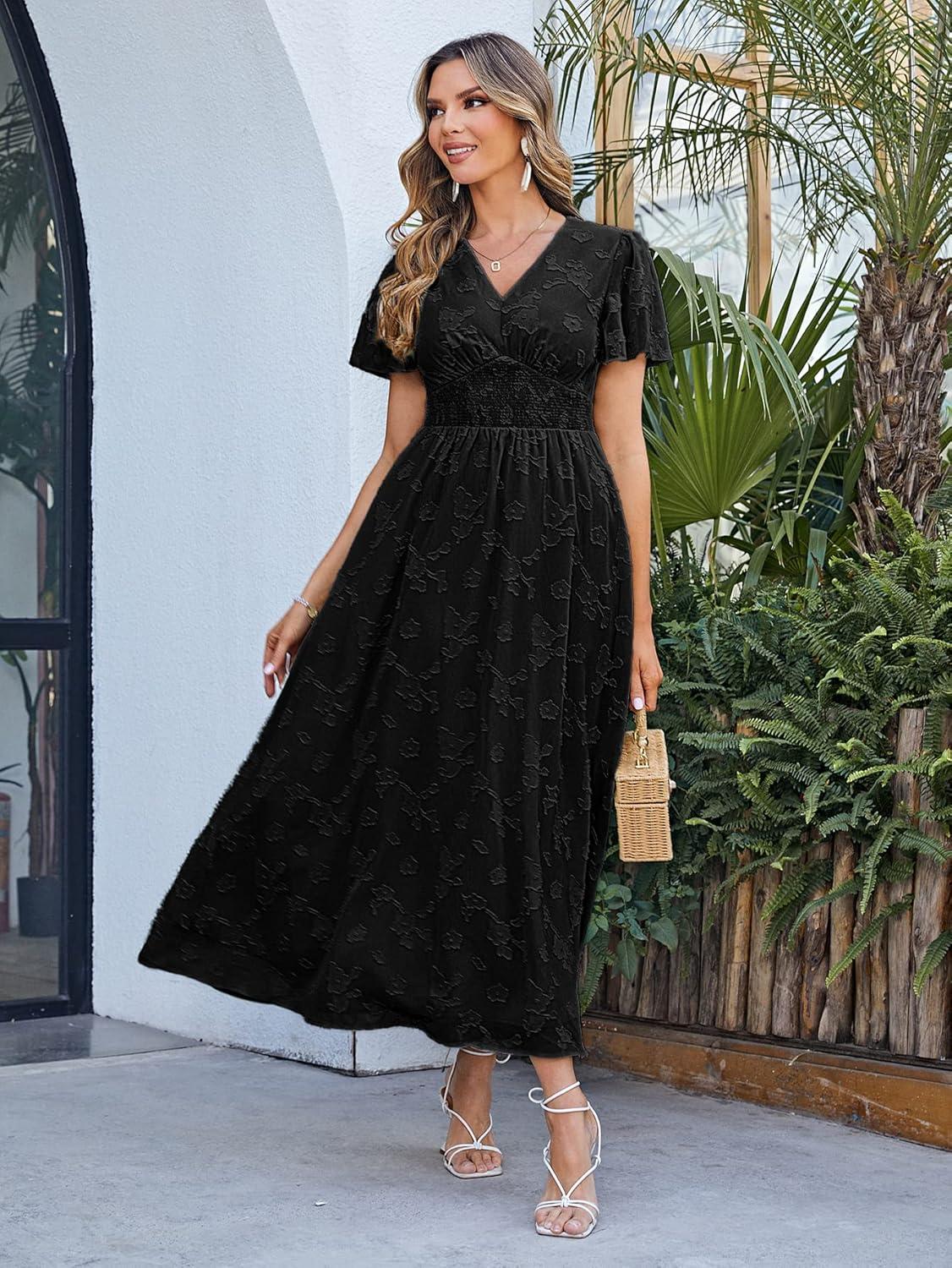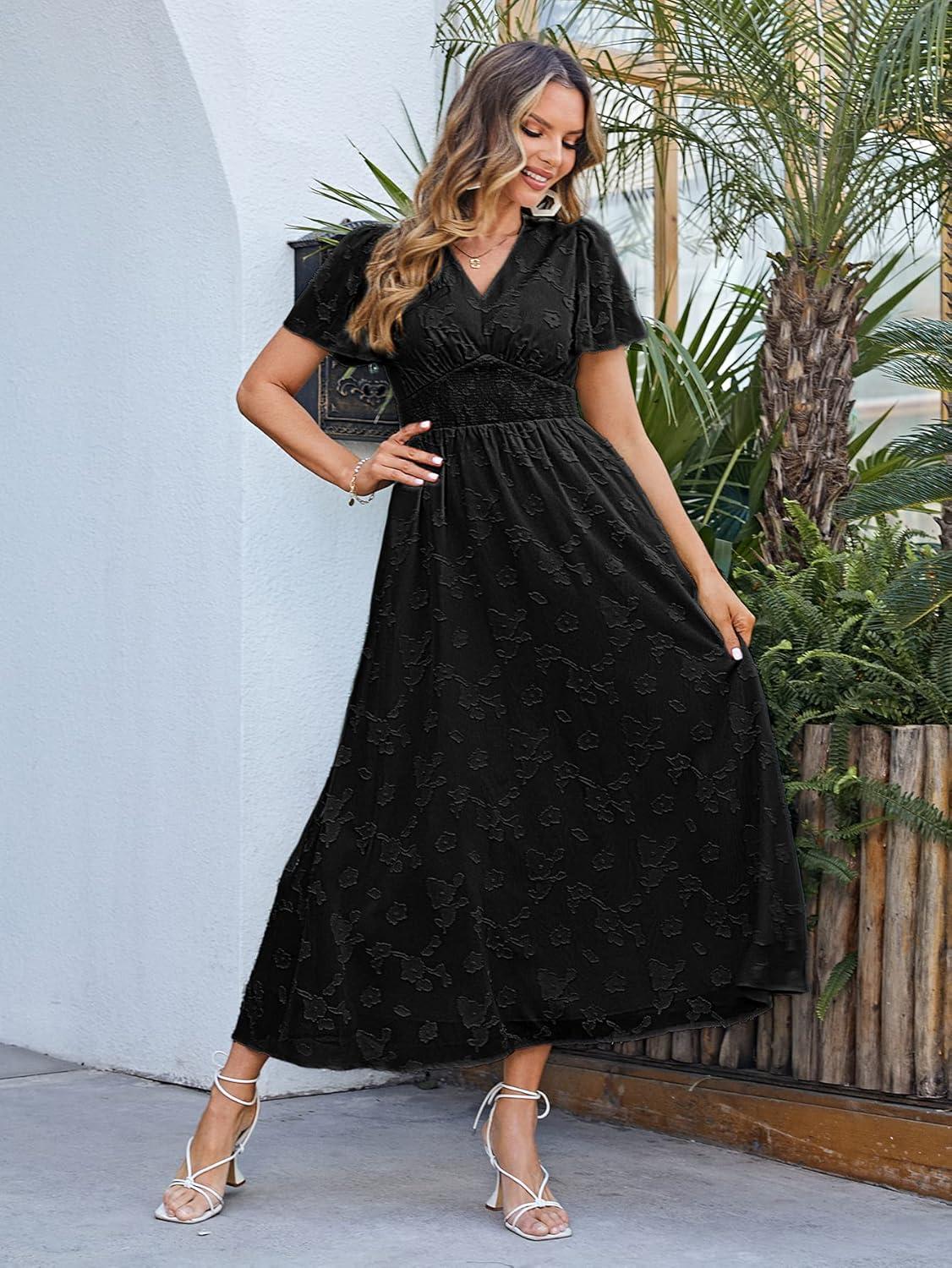 imageSimplee Womens Boho Floral Maxi Dress Flowy Casual V Neck Short Sleeve Wedding Guest Holiday Beach Long Dress1black