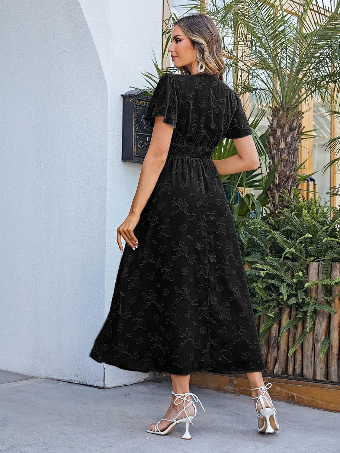 Simplee Women’s Boho Floral Maxi Dress Flowy Casual V Neck Short Sleeve Wedding Guest Holiday Beach Long Dress(1_black)