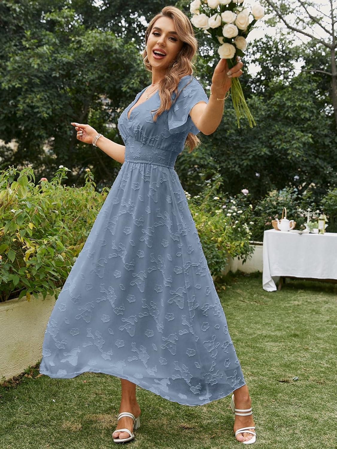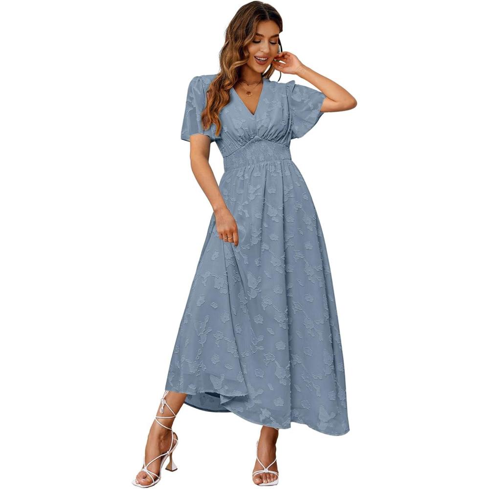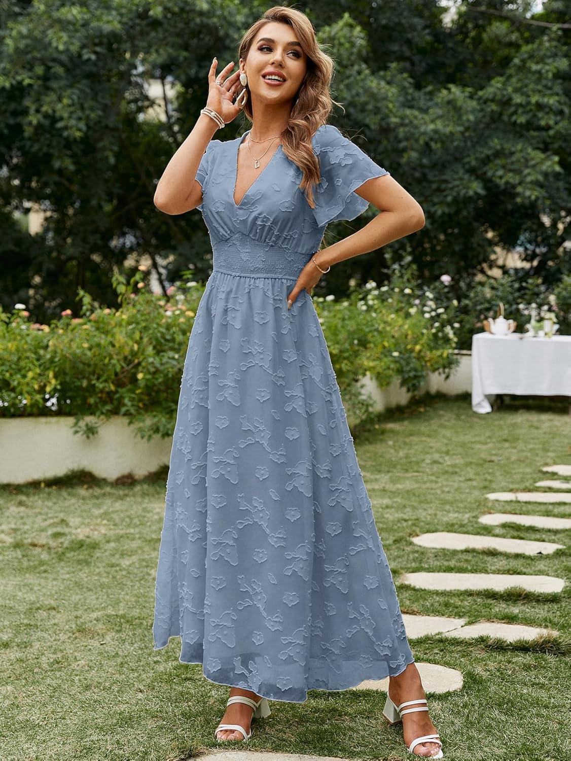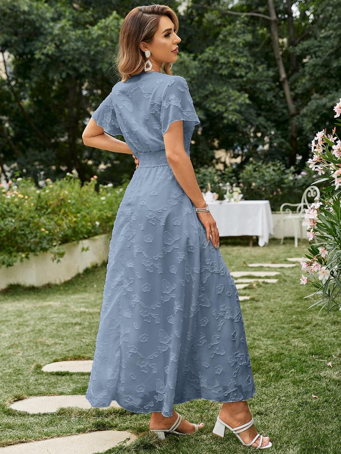 Simplee Women's Boho Floral Maxi Dress Flowy Casual V Neck Short Sleeve Wedding Guest Holiday Beach Long Dress(1_dusty Blue)