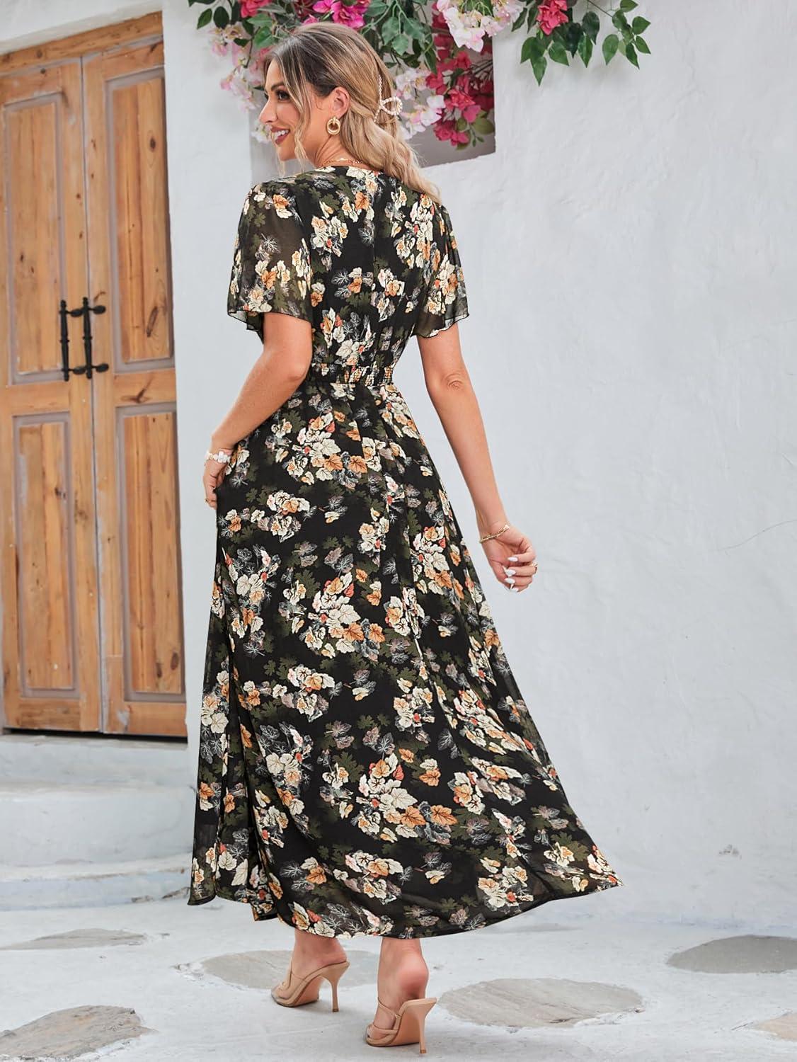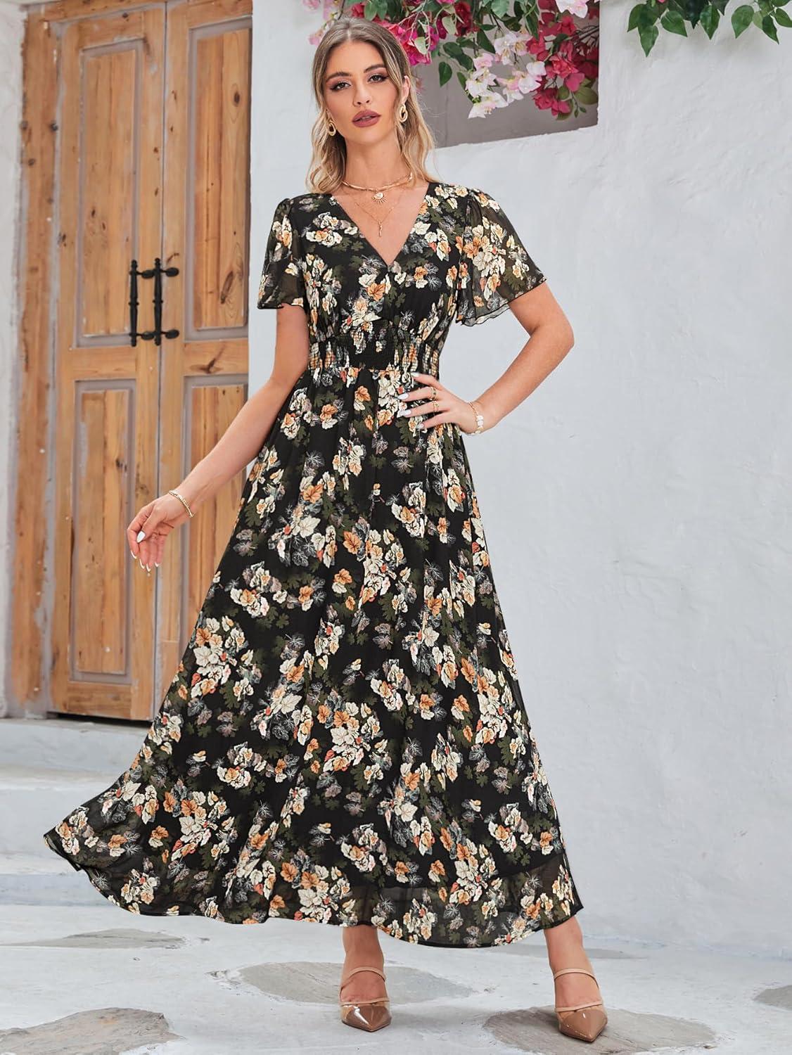 Simplee Women's Boho Floral Maxi Dress Flowy Casual V Neck Short Sleeve Wedding Guest Holiday Beach Long Dress(1#black Leaf)