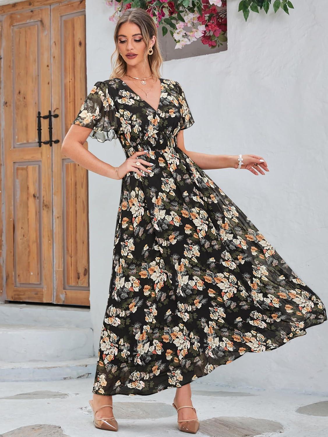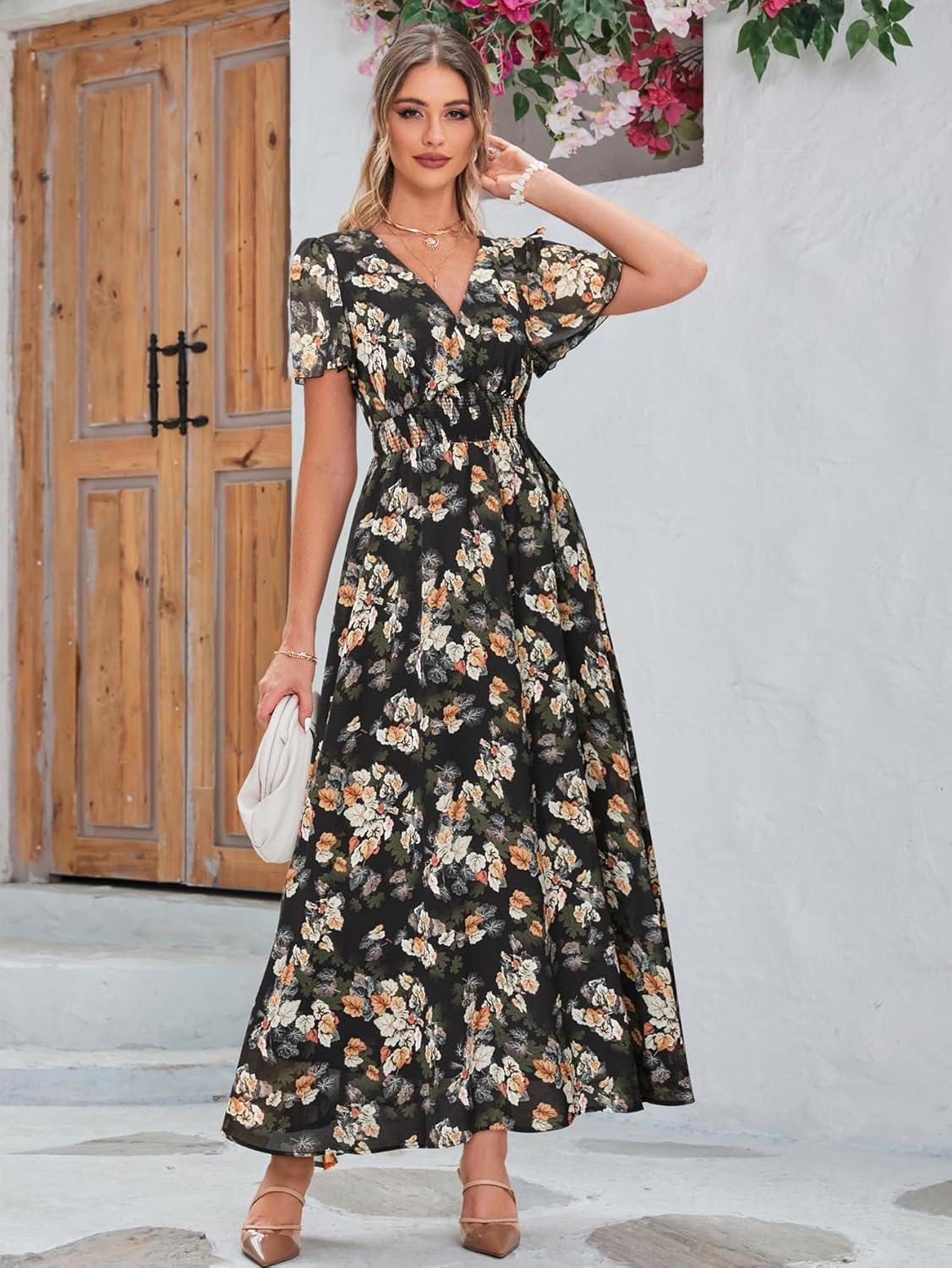 Simplee Women’s Boho Floral Maxi Dress Flowy Casual V Neck Short Sleeve Wedding Guest Holiday Beach Long Dress(1#black Leaf)