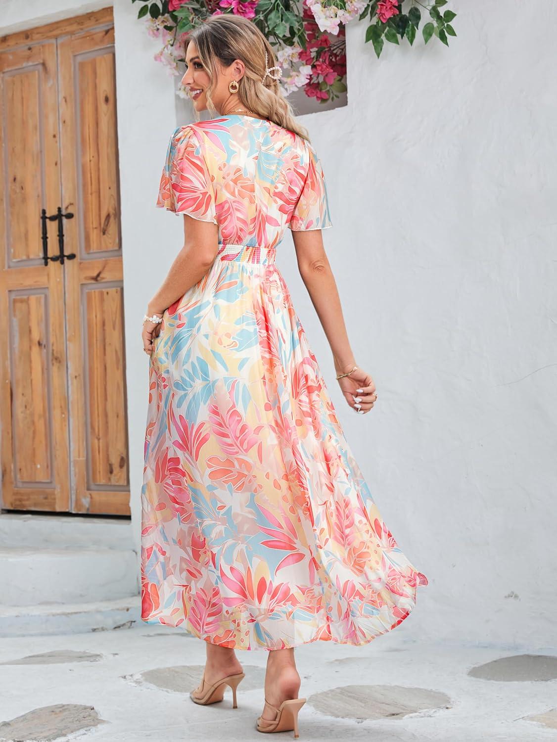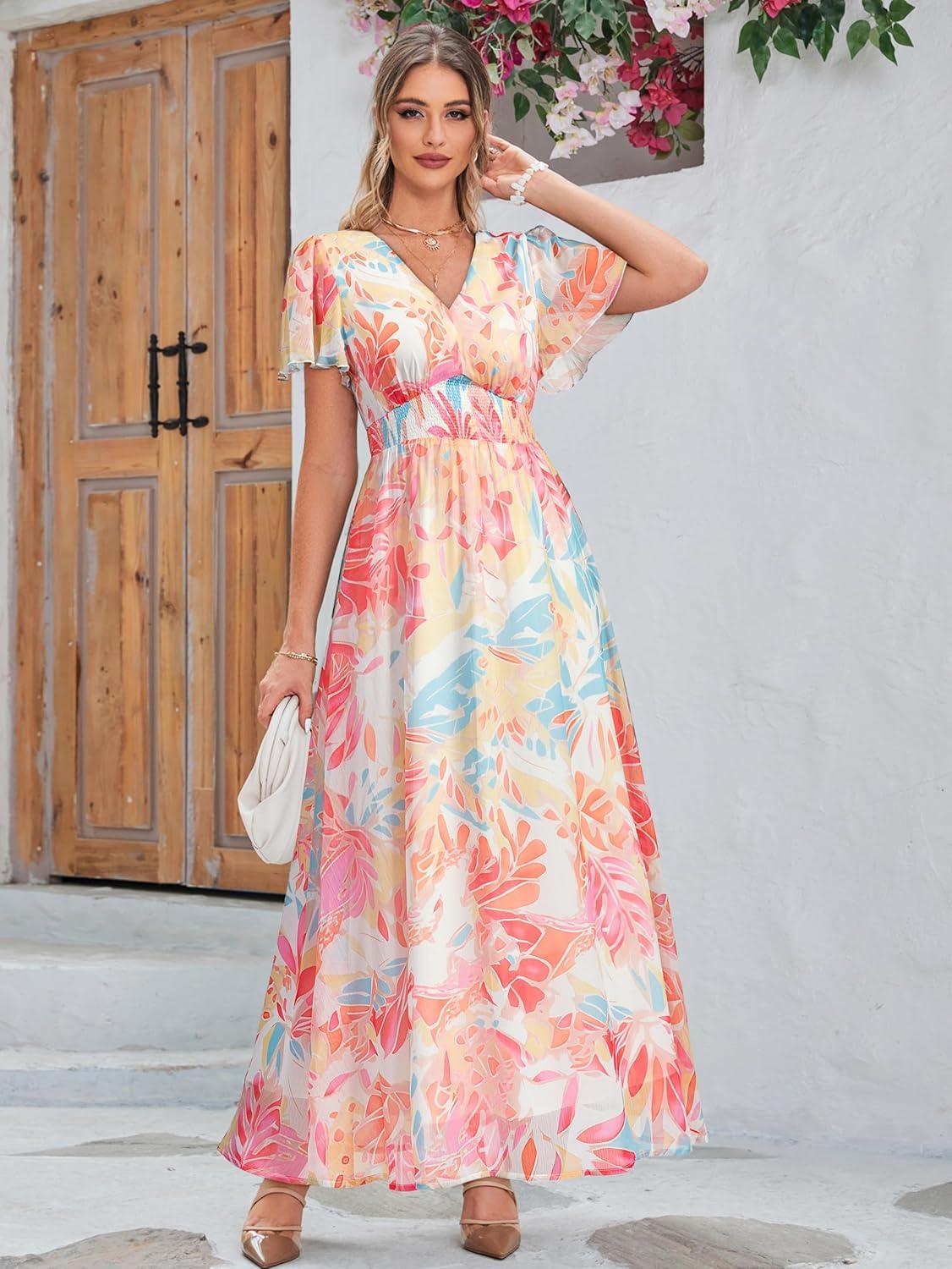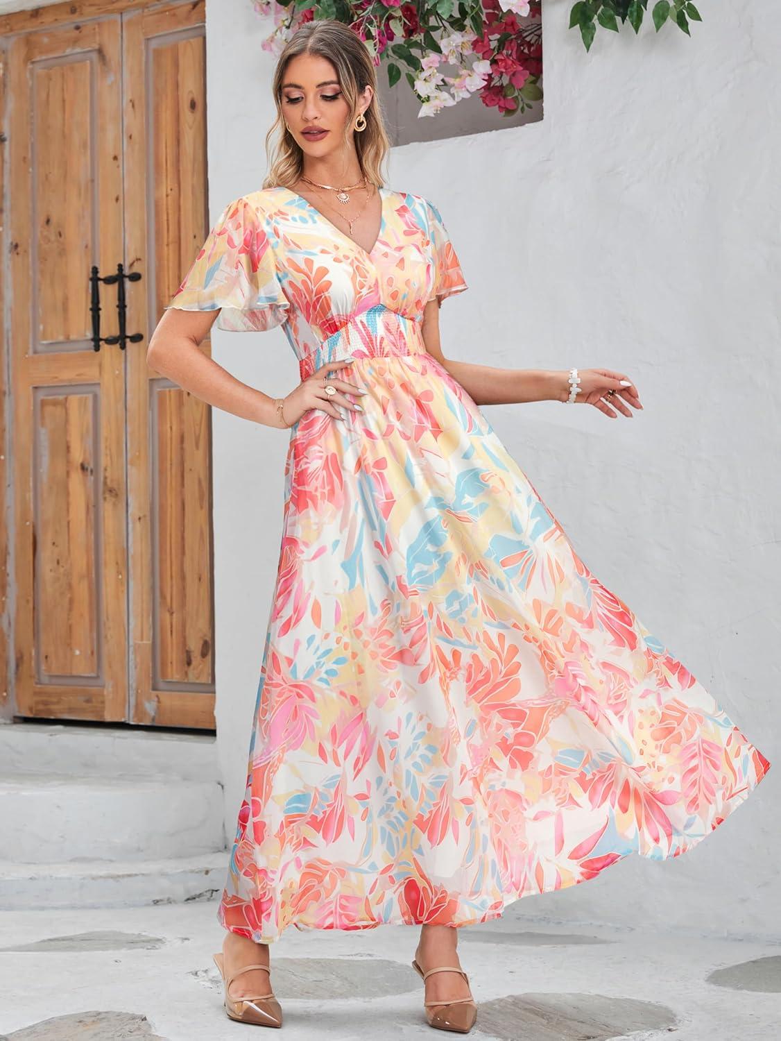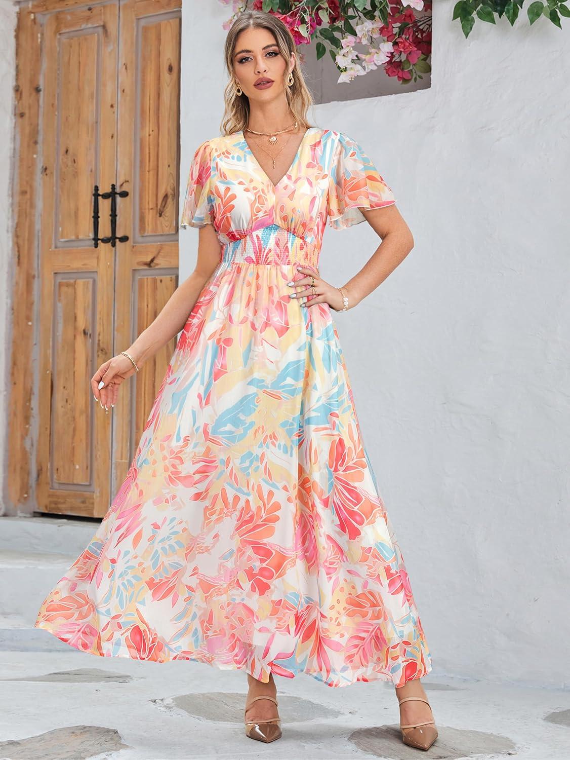 Simplee Women’s Boho Floral Maxi Dress Flowy Casual V Neck Short Sleeve Wedding Guest Holiday Beach Long Dress(1#blue Yellow Red)