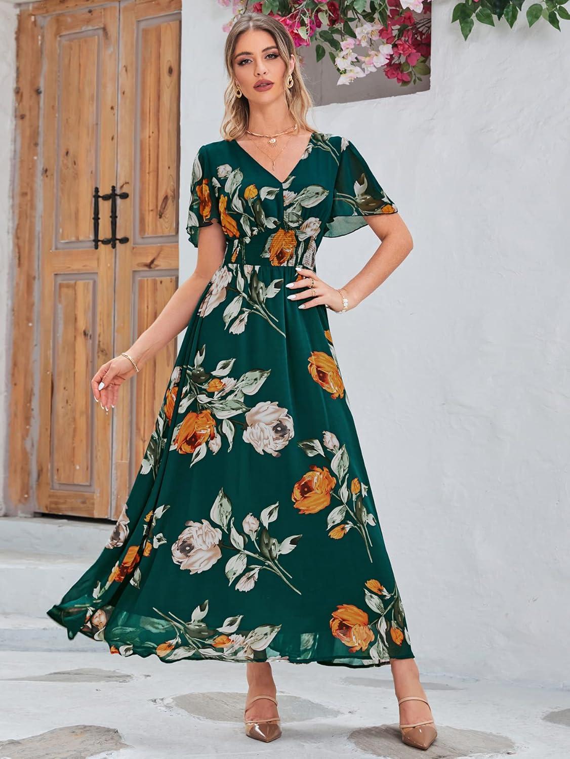 Simplee Women's Boho Floral Maxi Dress Flowy Casual V Neck Short Sleeve Wedding Guest Holiday Beach Long Dress(1#emerald Green)