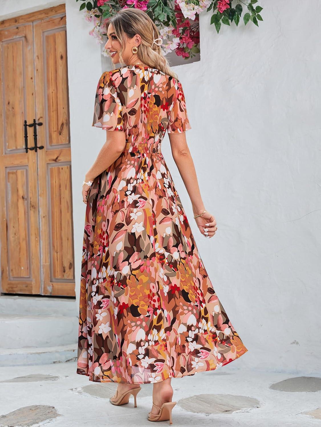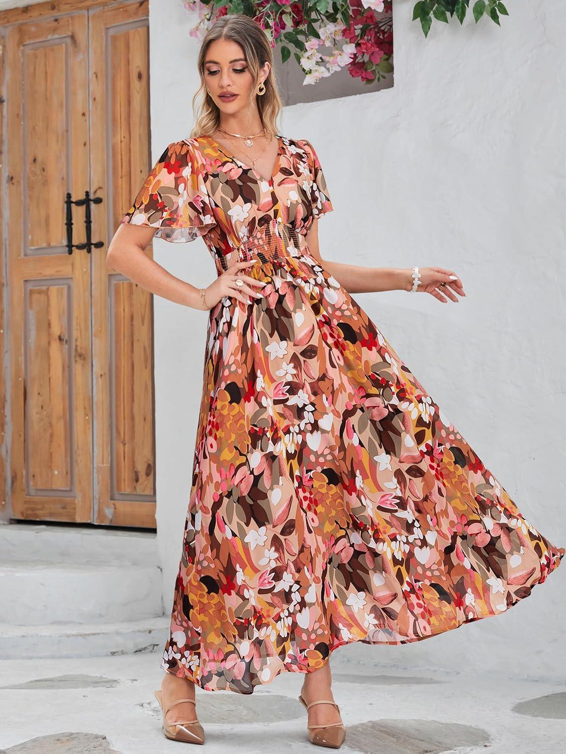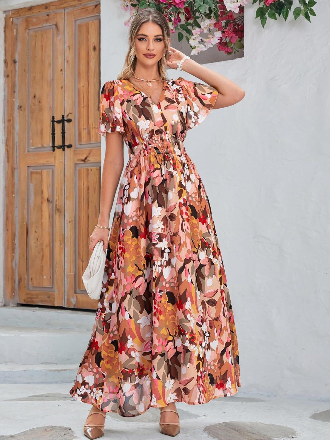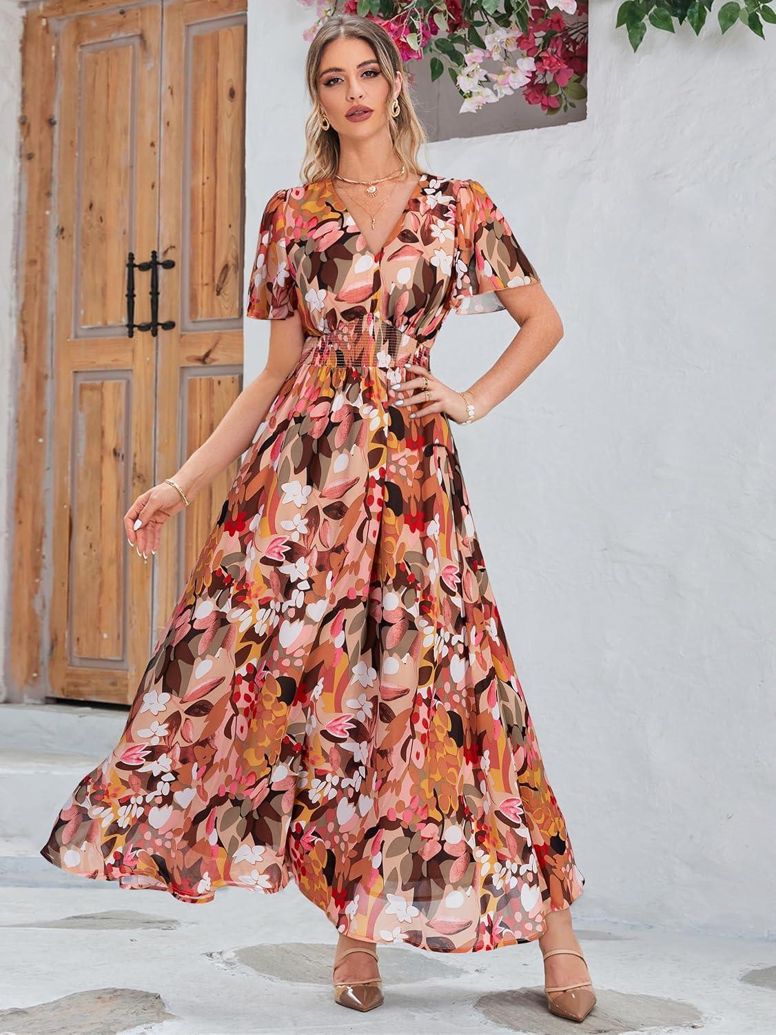 Simplee Women's Boho Floral Maxi Dress Flowy Casual V Neck Short Sleeve Wedding Guest Holiday Beach Long Dress(1#pink Orange Floral)