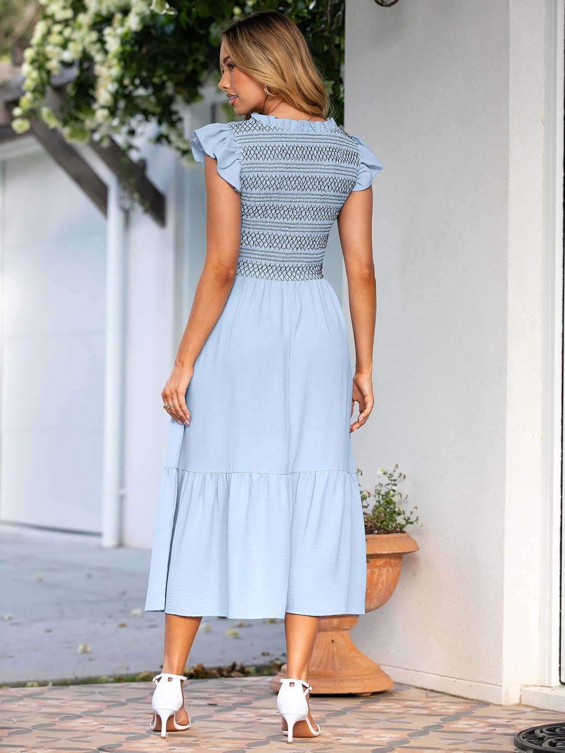 Simplee Womens Boho Maxi Dress Flutter Sleeve Summer Casual Smocked Waist A Line Flowy Tiered Dress with Pockets(Blue)