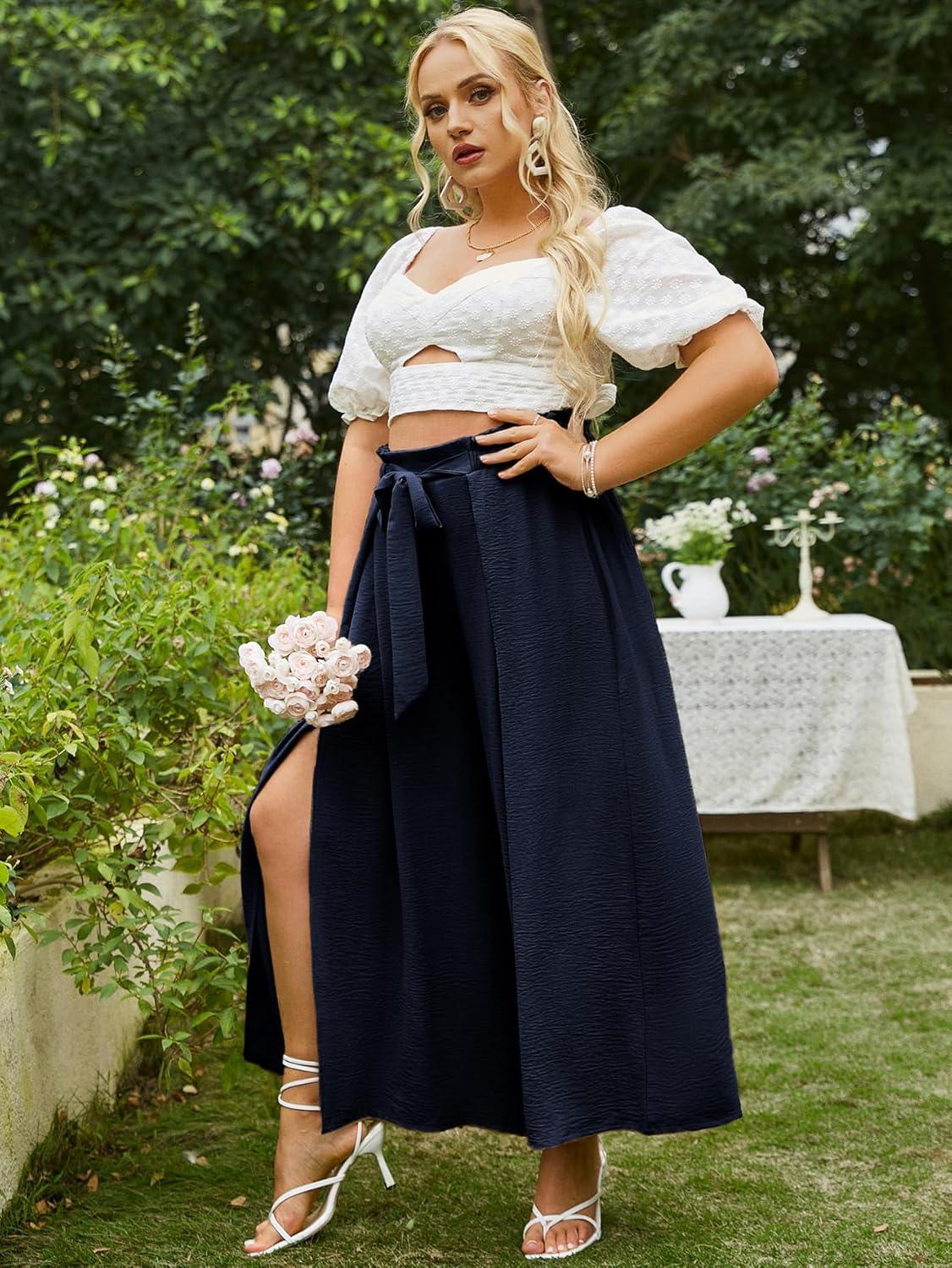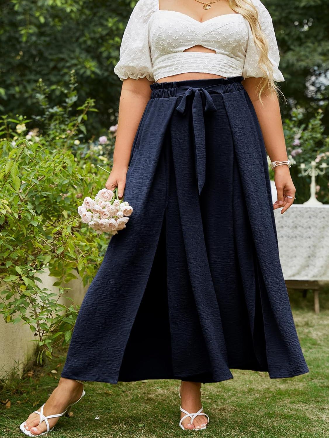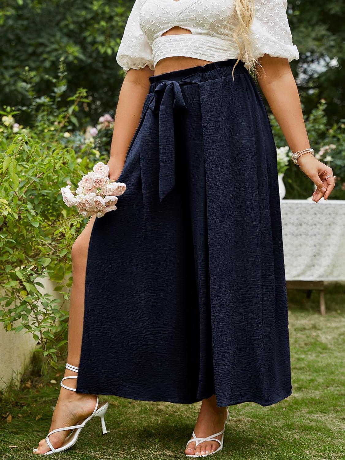 Simplee Women’s Casual Split Wide Leg Pants High Waist Palazzo Flowy Beach Pants Summer Boho Lounge Pants with Pockets(E9_navy Blue)