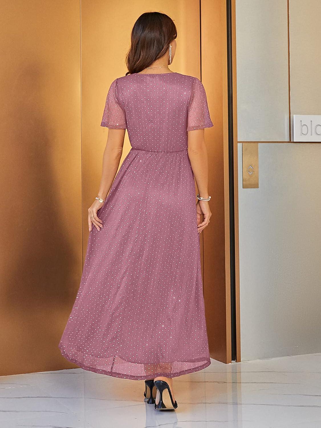 Simplee Women’s Fall Wedding Guest Maxi Dress Boho Flowy V Neck Short Sleeve Semi Formal Sparkly Bridesmaid Dress(Purple Pink)