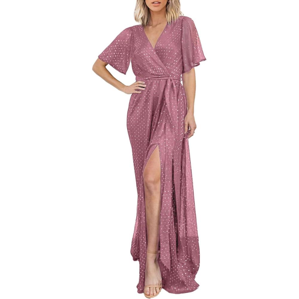 imageSimplee Womens Fall Wedding Guest Maxi Dress Boho Flowy V Neck Short Sleeve Semi Formal Sparkly Bridesmaid DressPurple Pink