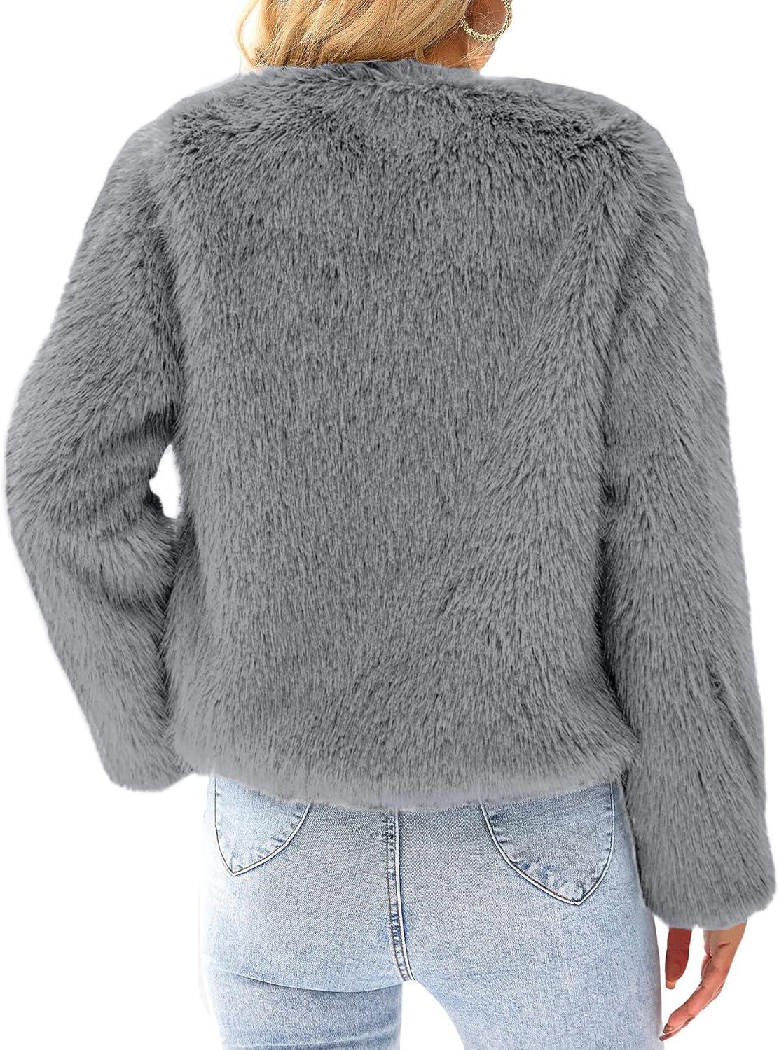 Simplee Women's Faux Fur Coat Furry Cropped Jacket Long Sleeve Warm Open Front Fur Jackets(Grey)