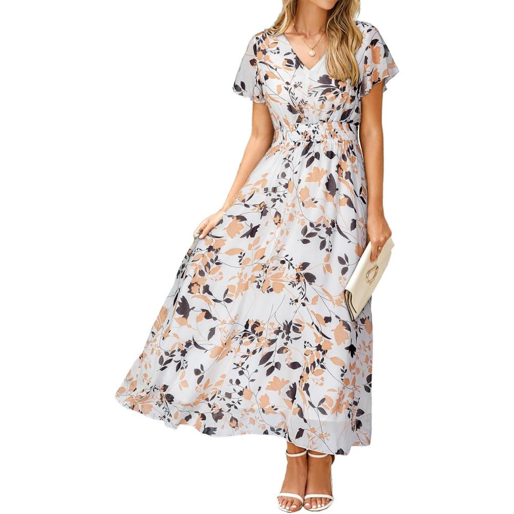 Simplee Womens Floral Maxi Dress Short Sleeve Summer Boho Wedding Guest Dress Empire Waist Chiffon Modest Midi Dresses(Beige Floral)
