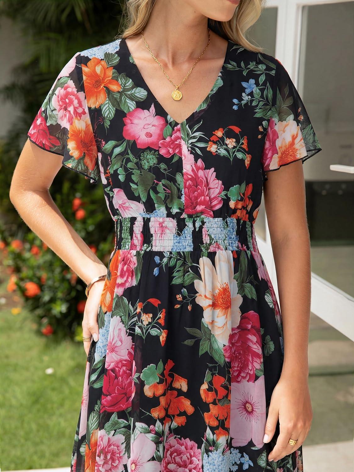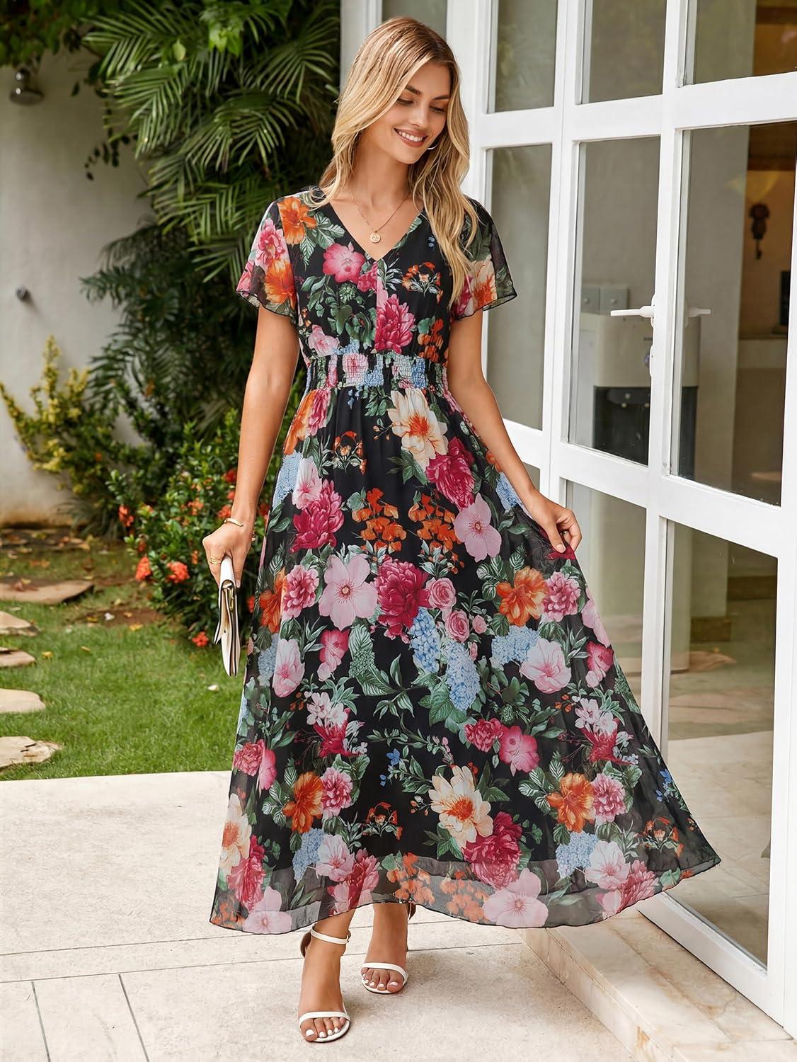 Simplee Womens Floral Maxi Dress Short Sleeve Summer Boho Wedding Guest Dress Empire Waist Chiffon Modest Midi Dresses(Black Peony)