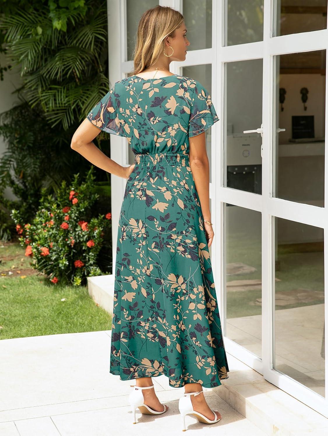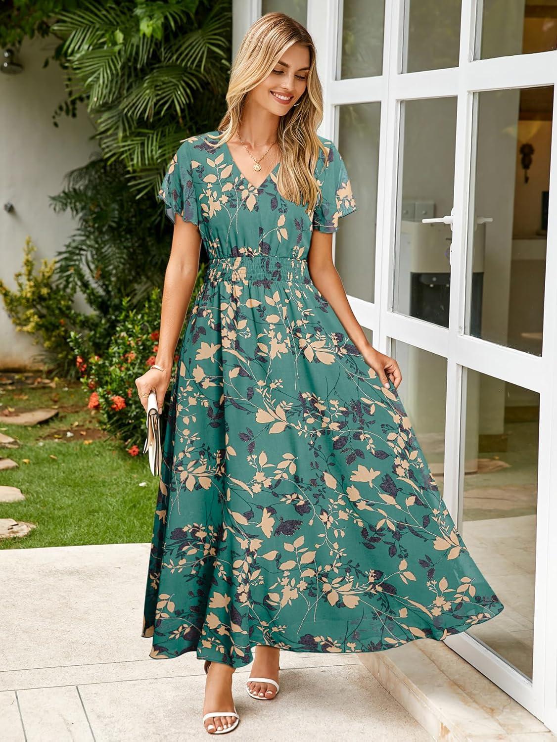 Simplee Womens Floral Maxi Dress Short Sleeve Summer Boho Wedding Guest Dress Empire Waist Chiffon Modest Midi Dresses(Emerald Green)