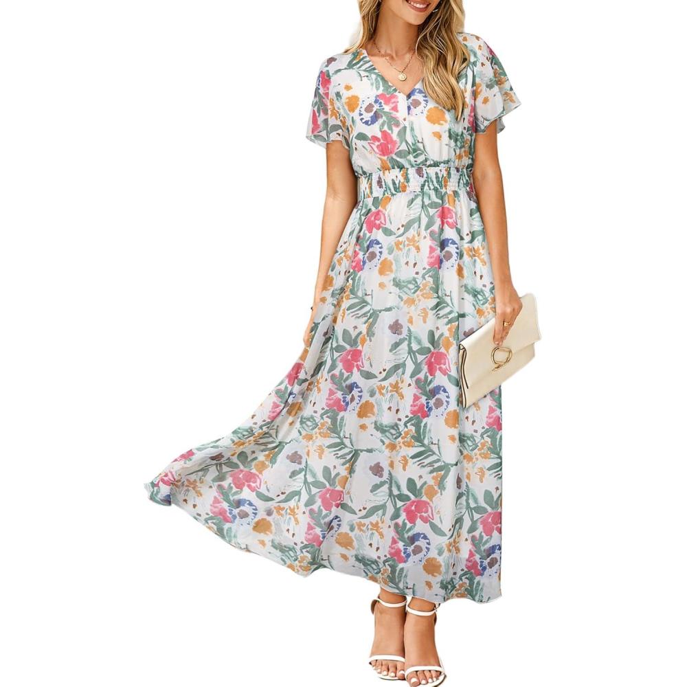 Simplee Womens Floral Maxi Dress Short Sleeve Summer Boho Wedding Guest Dress Empire Waist Chiffon Modest Midi Dresses(White 1)