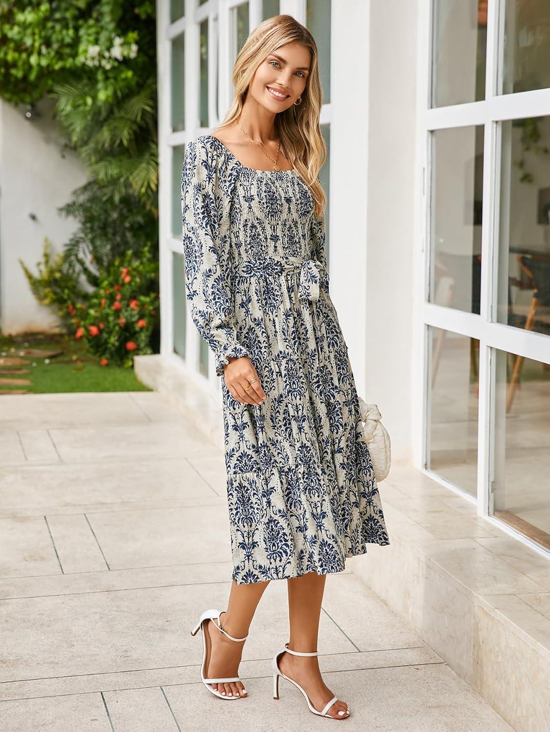 Simplee Womens Long Sleeve Maxi Dress Casual Square Neck Smocked Flowy Fall Wedding Guest Dresses(Floral-5)