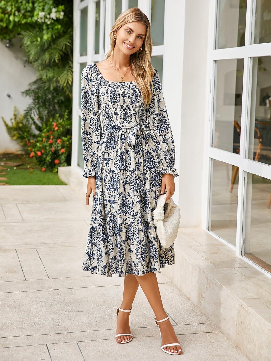 imageSimplee Womens Long Sleeve Maxi Dress Casual Square Neck Smocked Flowy Fall Wedding Guest DressesFloral5