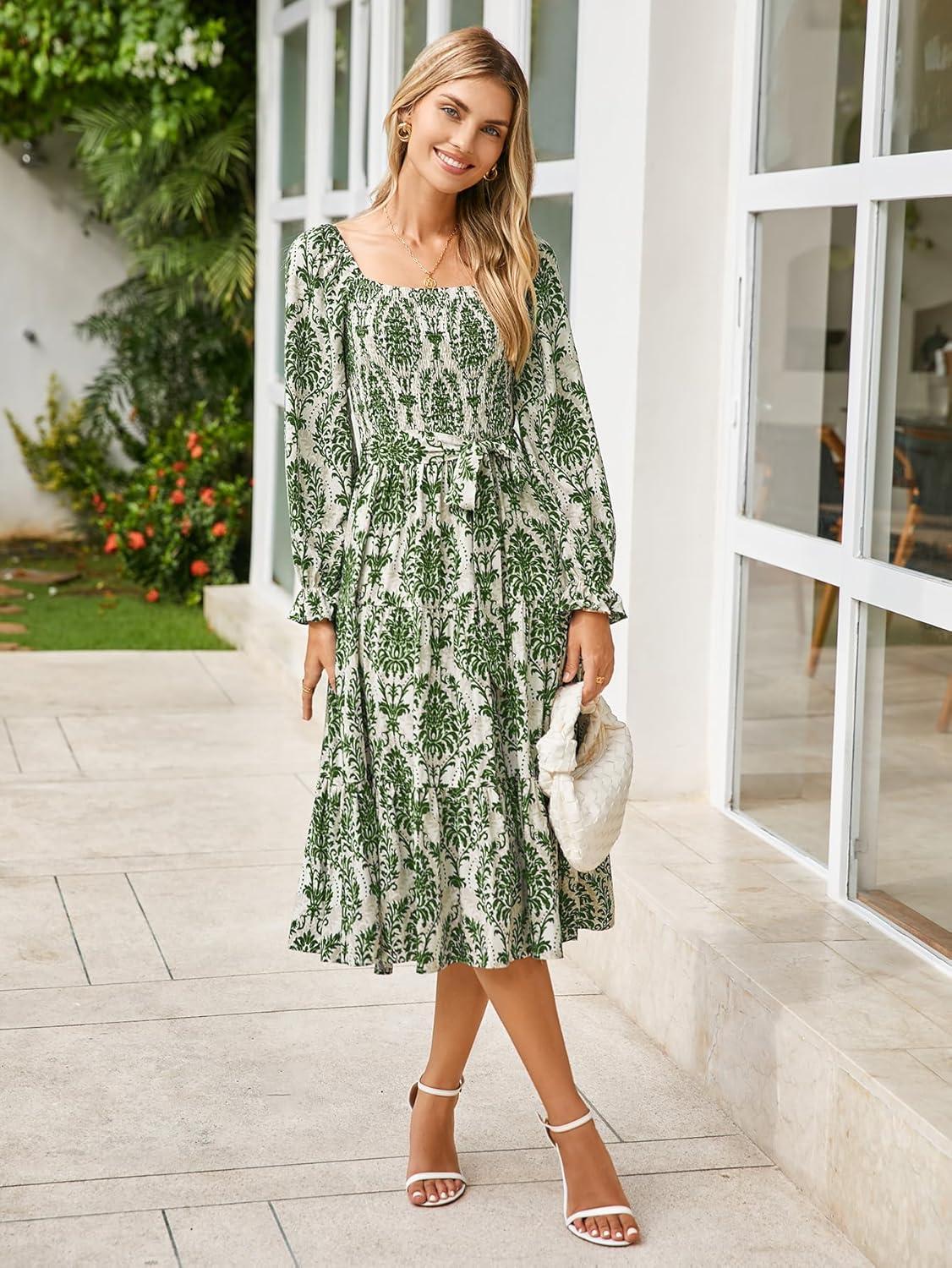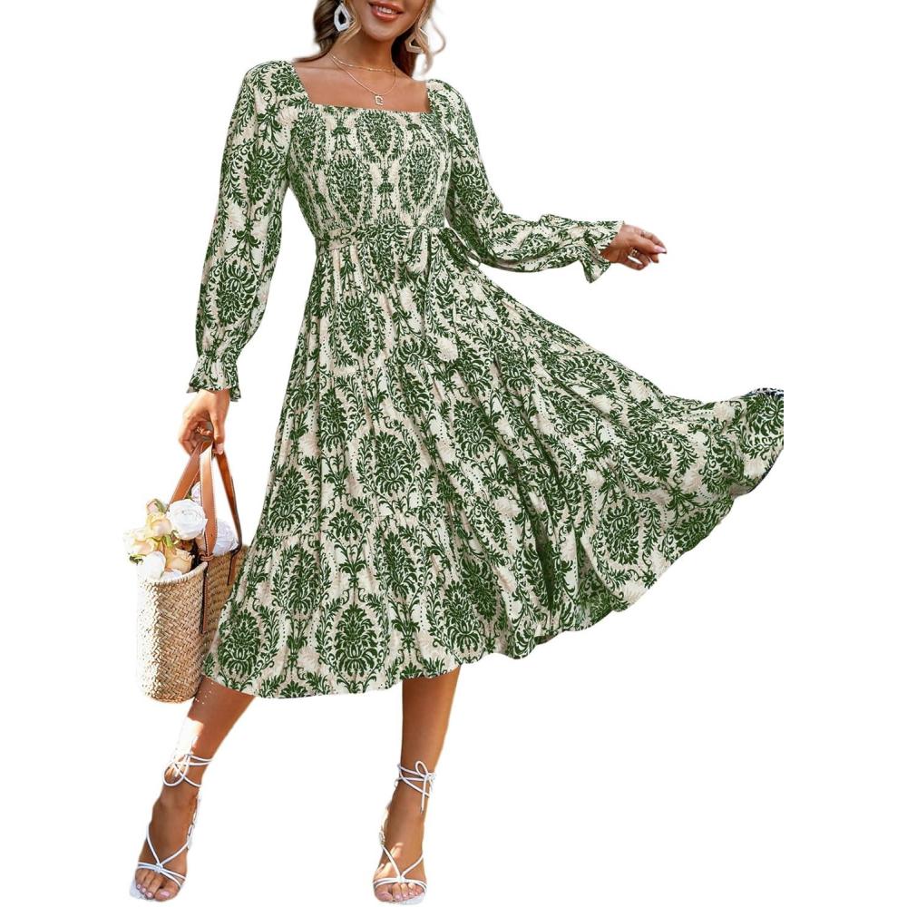 Simplee Womens Long Sleeve Maxi Dress Casual Square Neck Smocked Flowy Fall Wedding Guest Dresses(Floral-5)