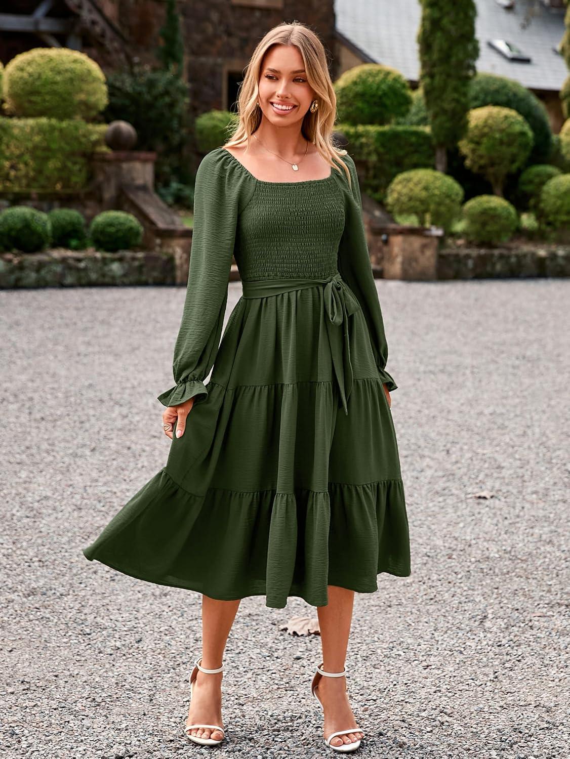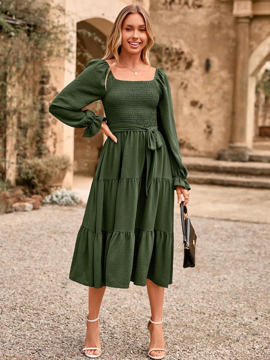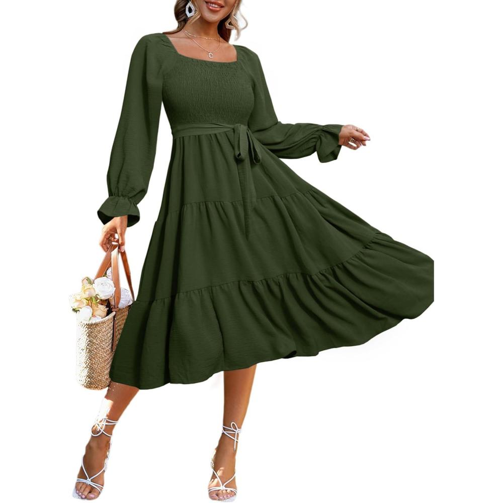 Simplee Womens Long Sleeve Maxi Dress Casual Square Neck Smocked Flowy Fall Wedding Guest Dresses(Solid-4)