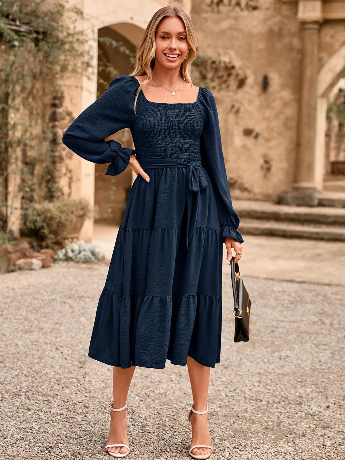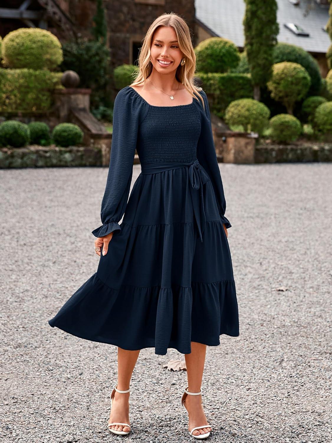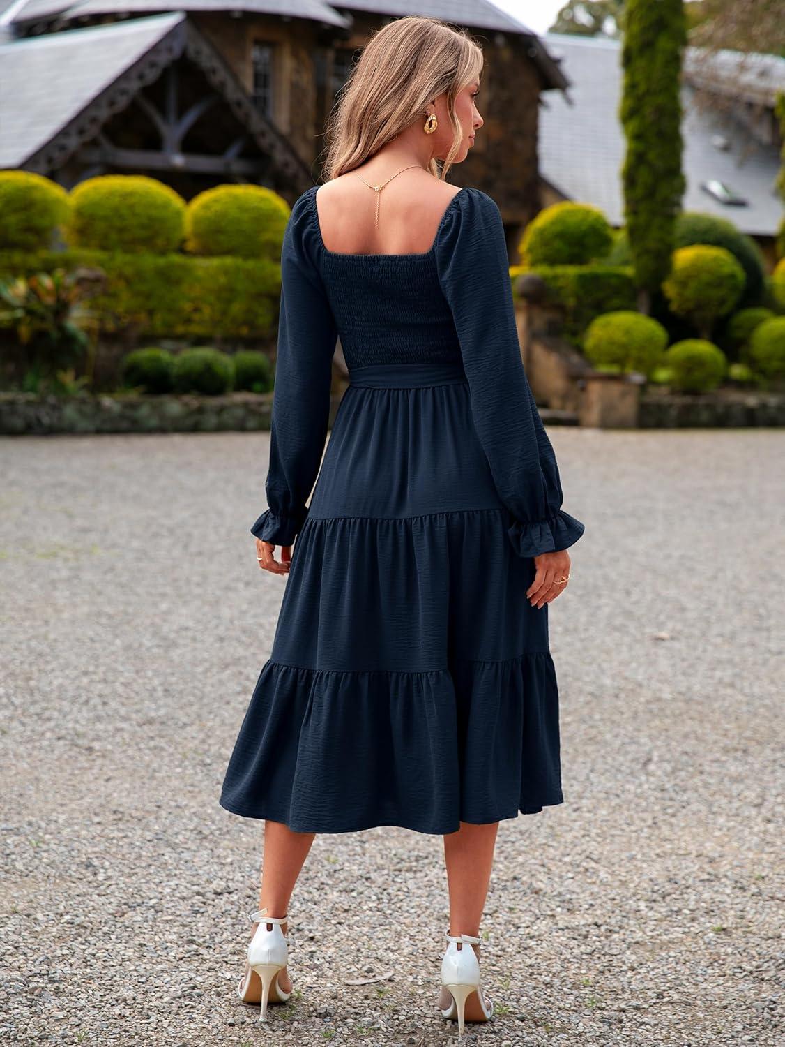 Simplee Womens Long Sleeve Maxi Dress Casual Square Neck Smocked Flowy Fall Wedding Guest Dresses(Solid-4)