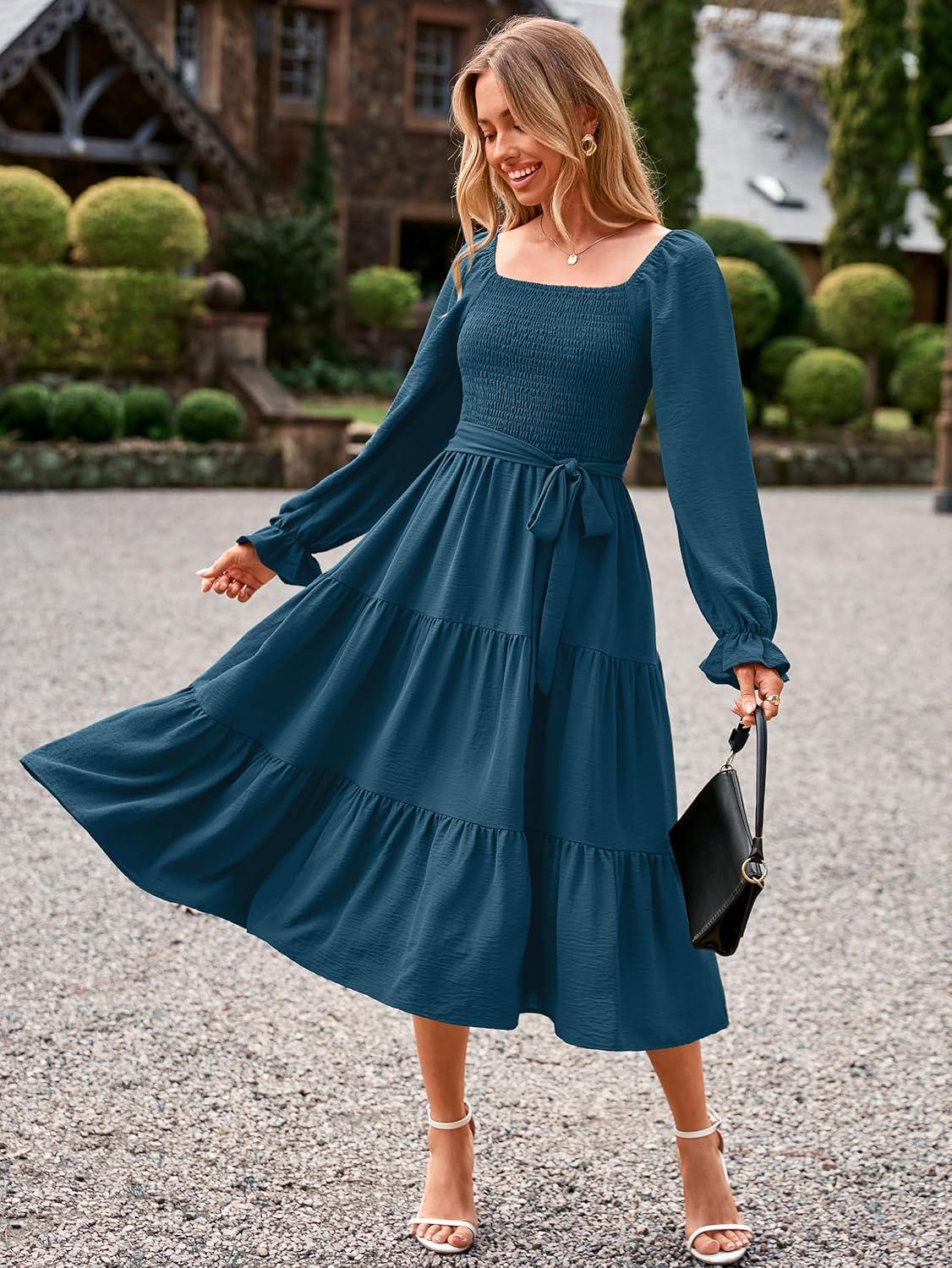 Simplee Womens Long Sleeve Maxi Dress Casual Square Neck Smocked Flowy Fall Wedding Guest Dresses(Solid-7)