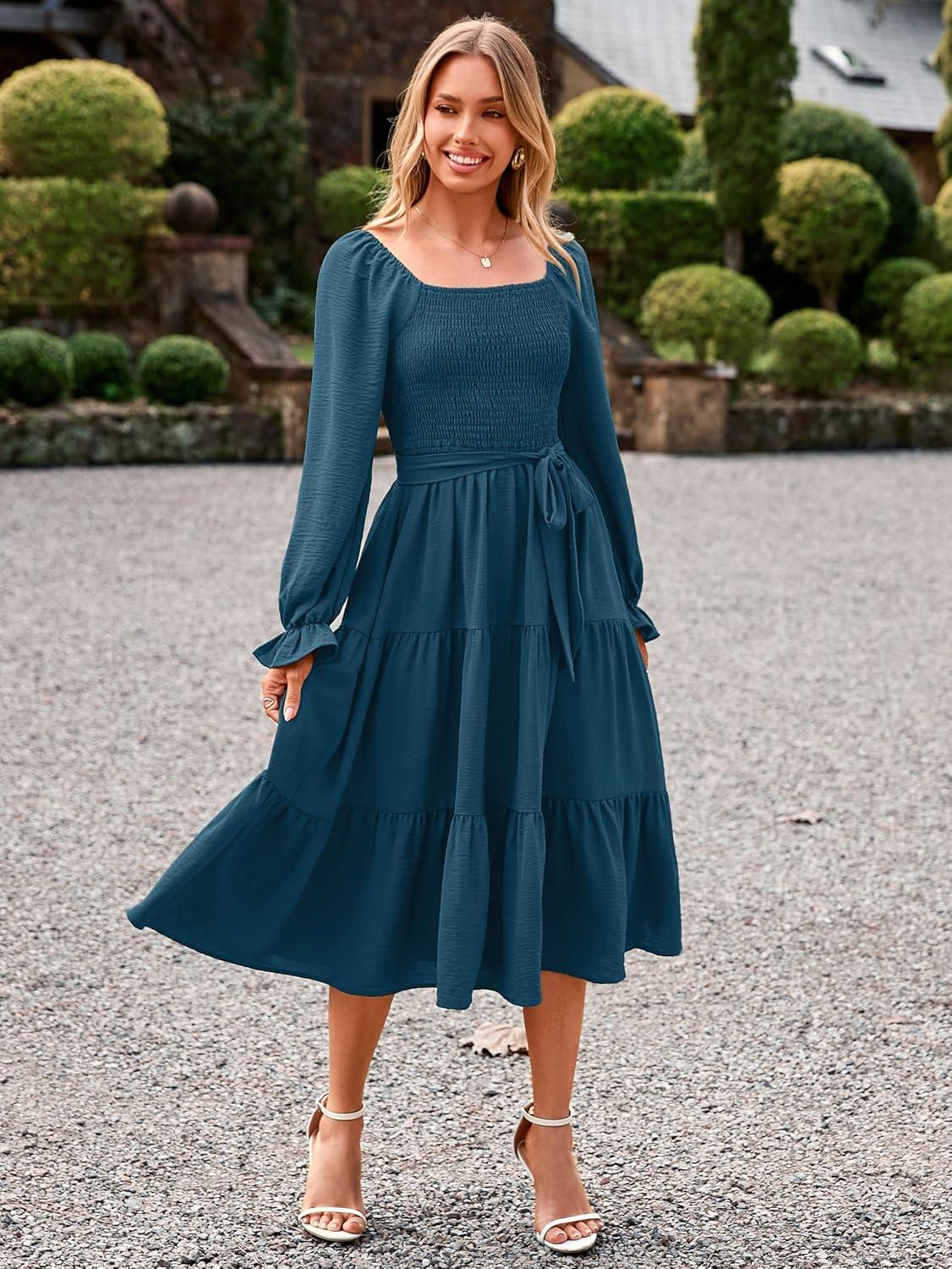 Simplee Womens Long Sleeve Maxi Dress Casual Square Neck Smocked Flowy Fall Wedding Guest Dresses(Solid-8)
