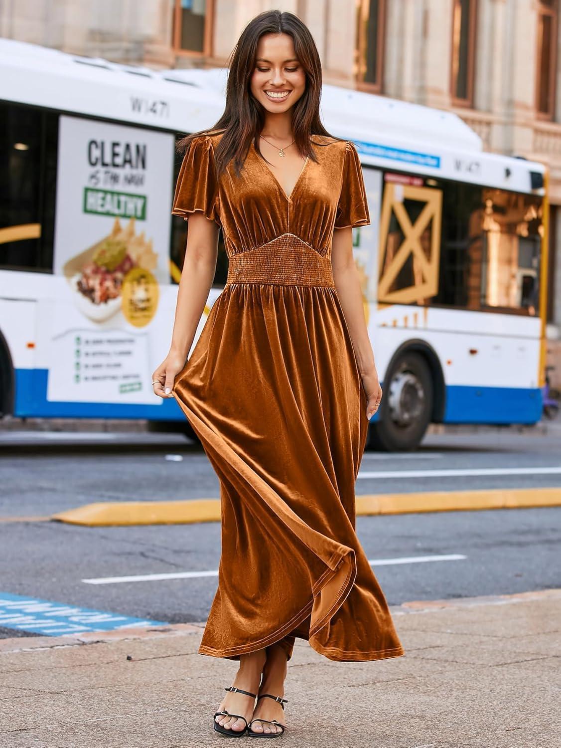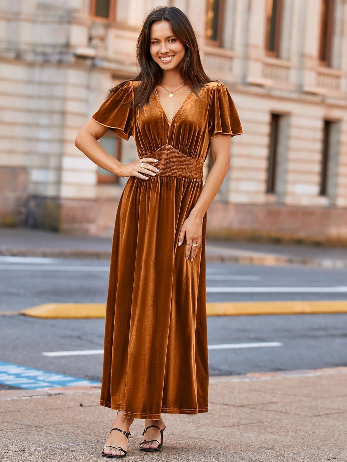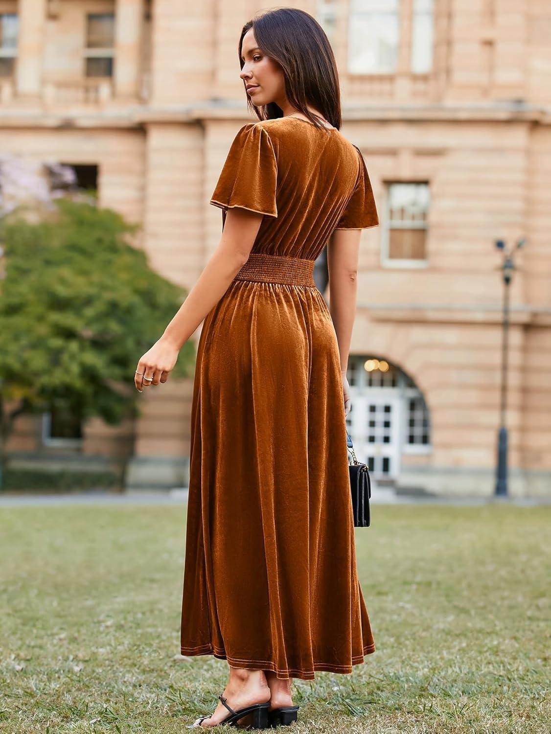 Simplee Women’s Short Sleeve Velvet Maxi Dress V Neck Empire Waist Long Formal Wedding Guest Dresses(#Burnt Orange)