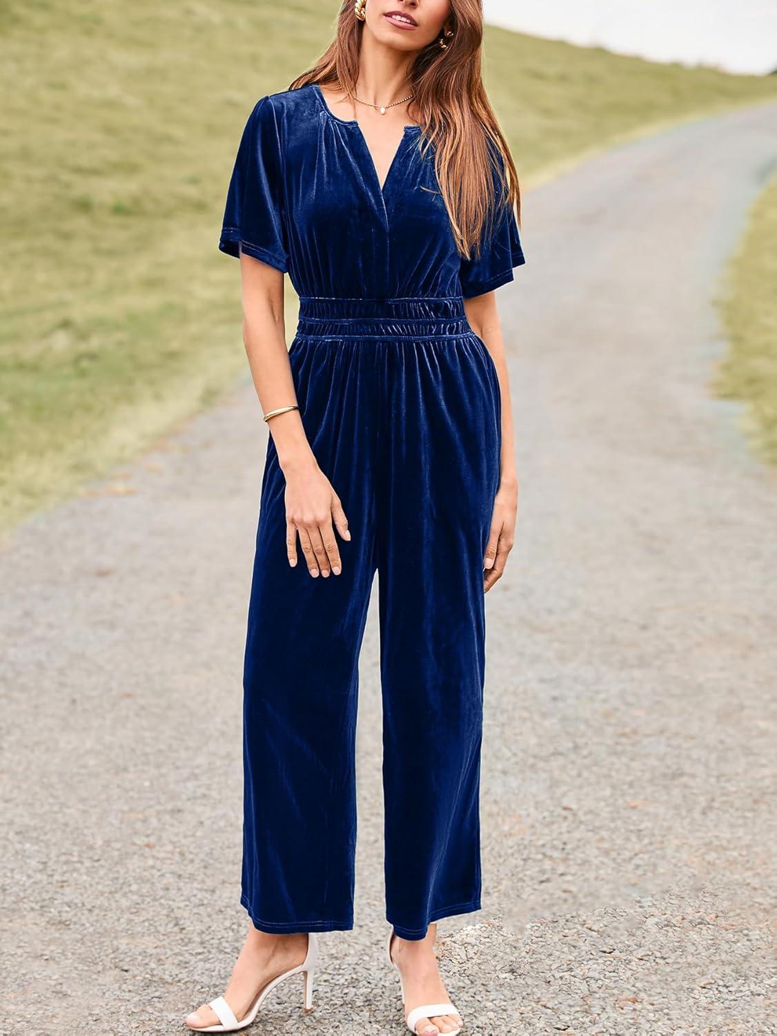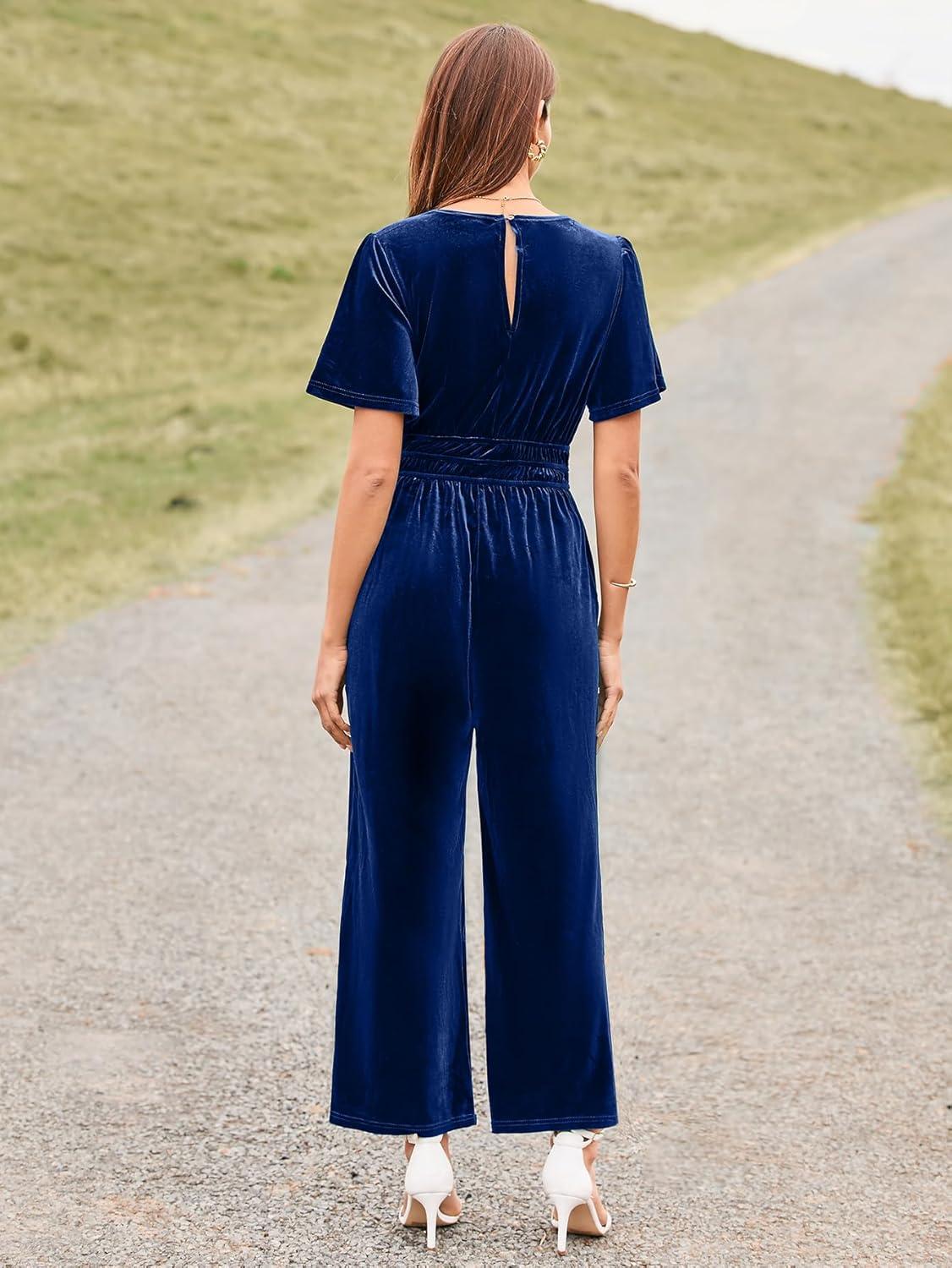 Simplee Womens Short Sleeve Wide Leg Velvet Jumpsuit Dressy V Neck Elastic Waist Formal Jumpsuits 2024 Winter Holiday Outfits(Velvet-lake Blue)