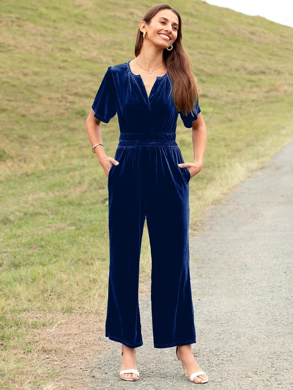 imageSimplee Womens Short Sleeve Wide Leg Velvet Jumpsuit Dressy V Neck Elastic Waist Formal Jumpsuits 2024 Winter Holiday OutfitsVelvetnavy Blue
