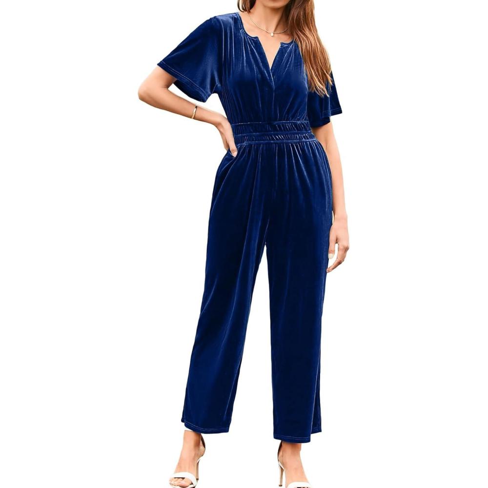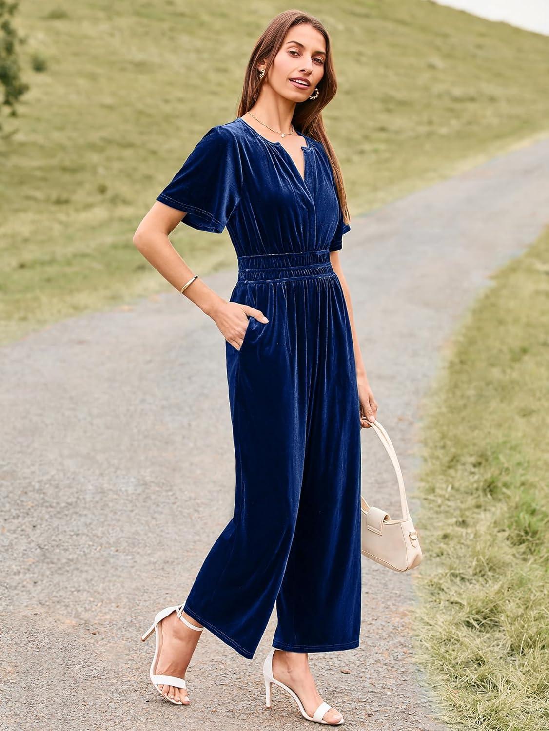 imageSimplee Womens Short Sleeve Wide Leg Velvet Jumpsuit Dressy V Neck Elastic Waist Formal Jumpsuits 2024 Winter Holiday OutfitsVelvetlake Blue