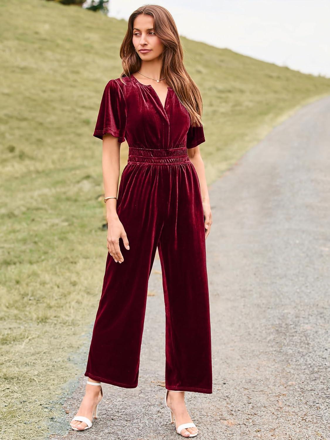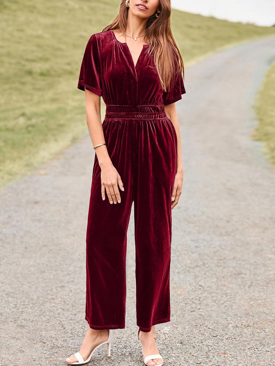Simplee Womens Short Sleeve Wide Leg Velvet Jumpsuit Dressy V Neck Elastic Waist Formal Jumpsuits 2024 Winter Holiday Outfits(Velvet-wine Red)
