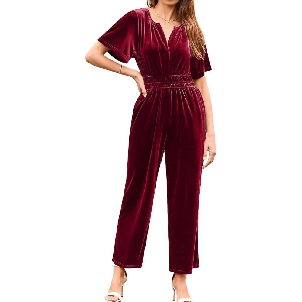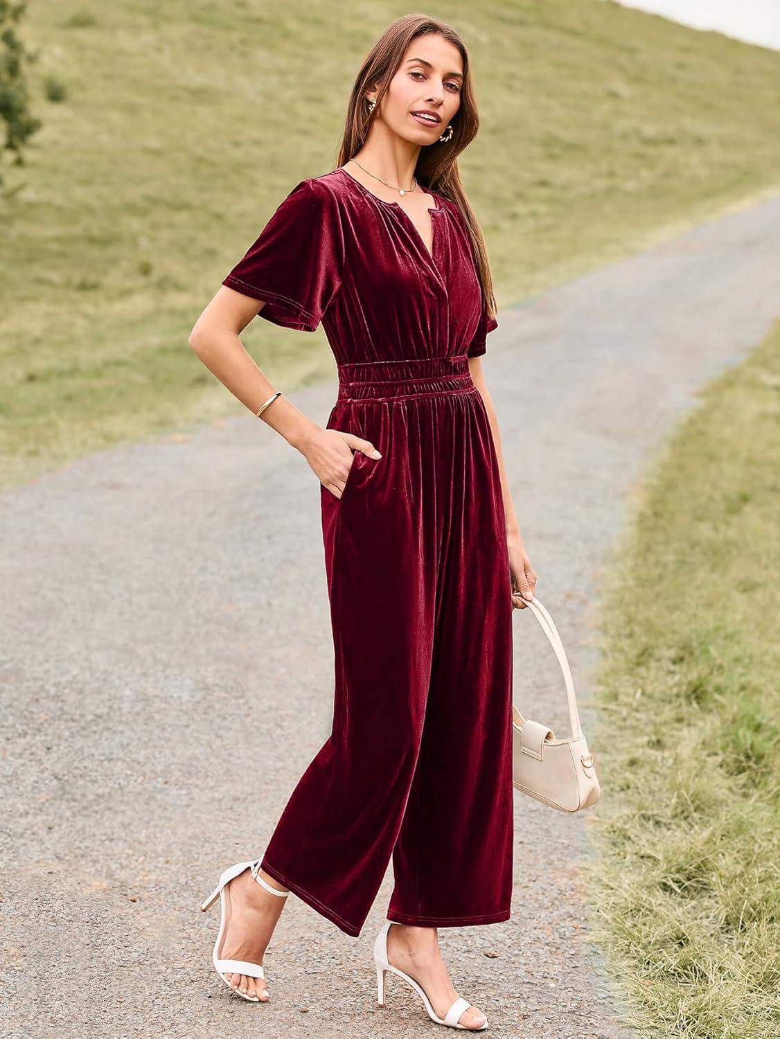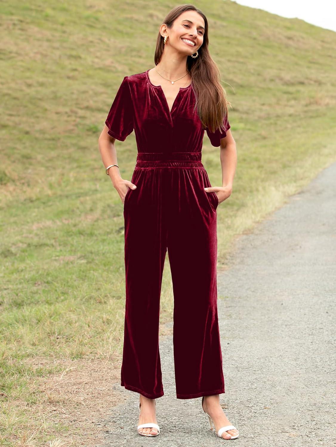 imageSimplee Womens Short Sleeve Wide Leg Velvet Jumpsuit Dressy V Neck Elastic Waist Formal Jumpsuits 2024 Winter Holiday OutfitsVelvetwine Red