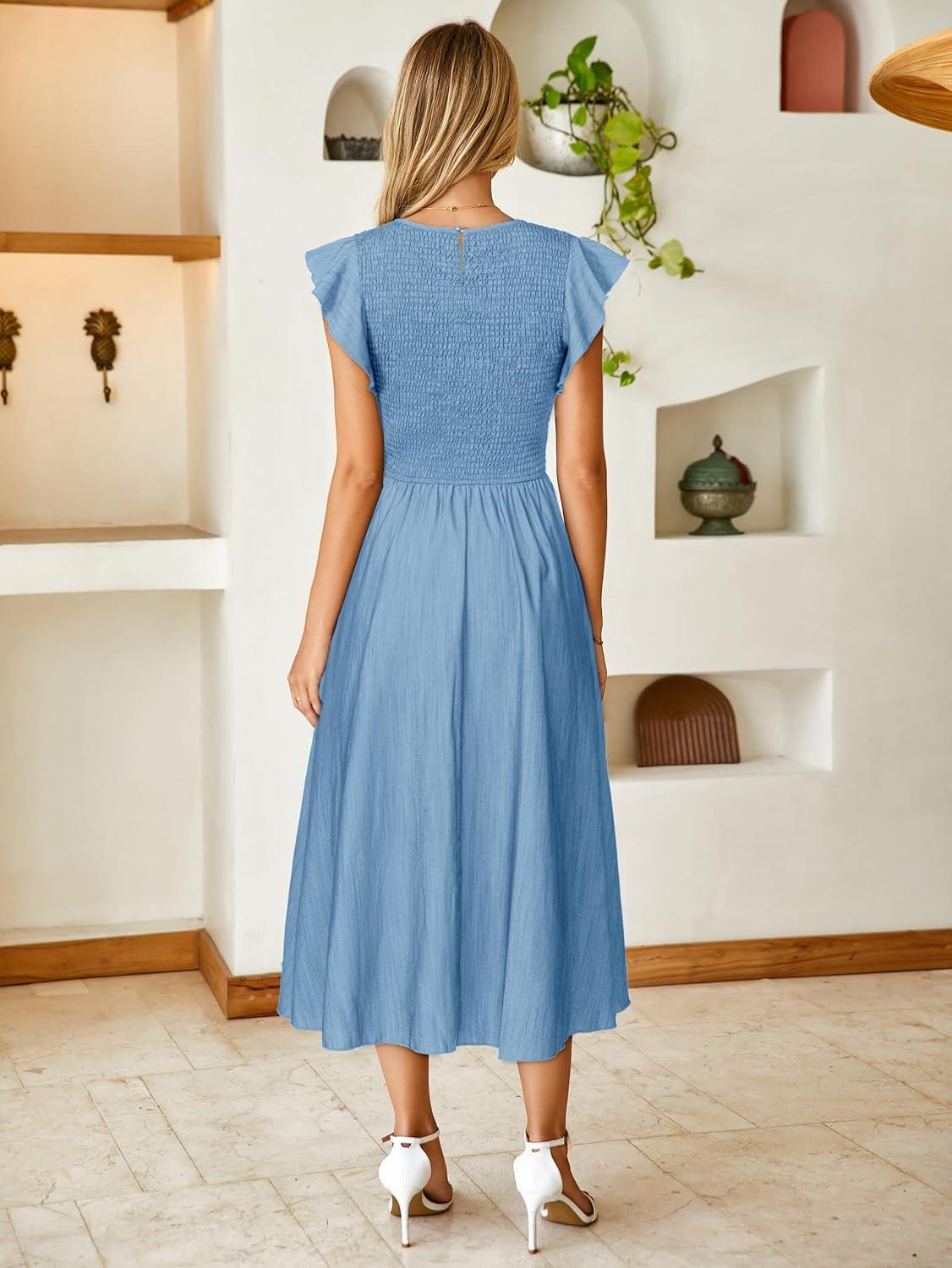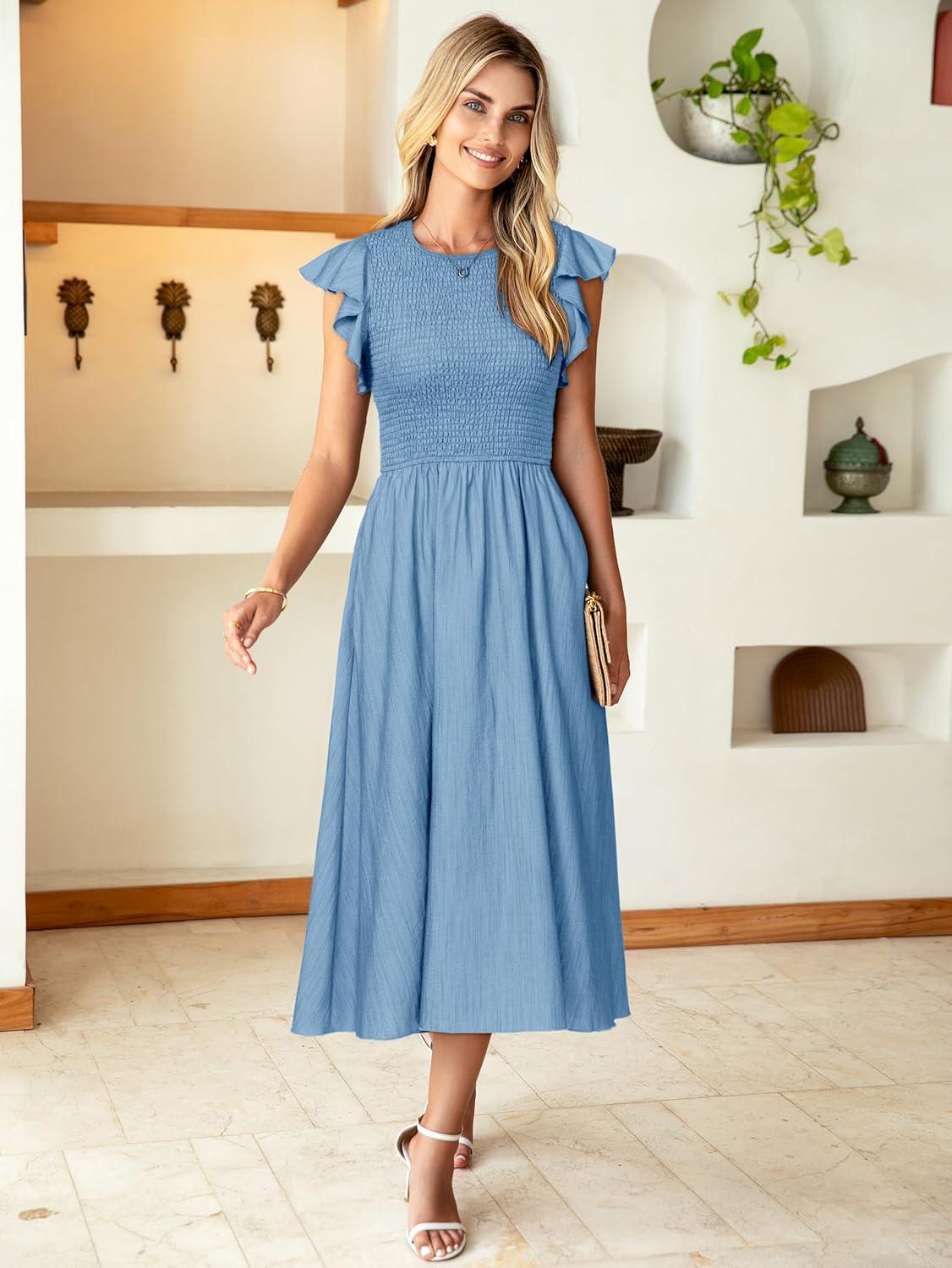 Simplee Womens Striped Midi Summer Dress Smocked Flutter Short Sleeve Dress 2025 Flowy Casual Dress with Pockets(Denim-like Light Blue)