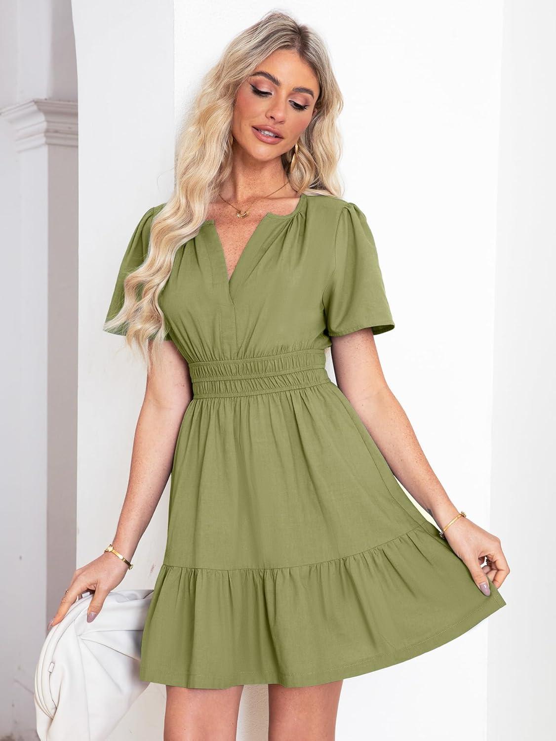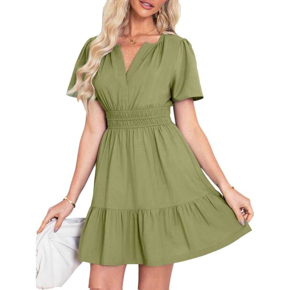 Simplee Women's Summer Beach Wedding Linen Mini Dress Casual Short Sleeve V Neck Empire Waist Flowy Boho Sundress(#Olive Green)