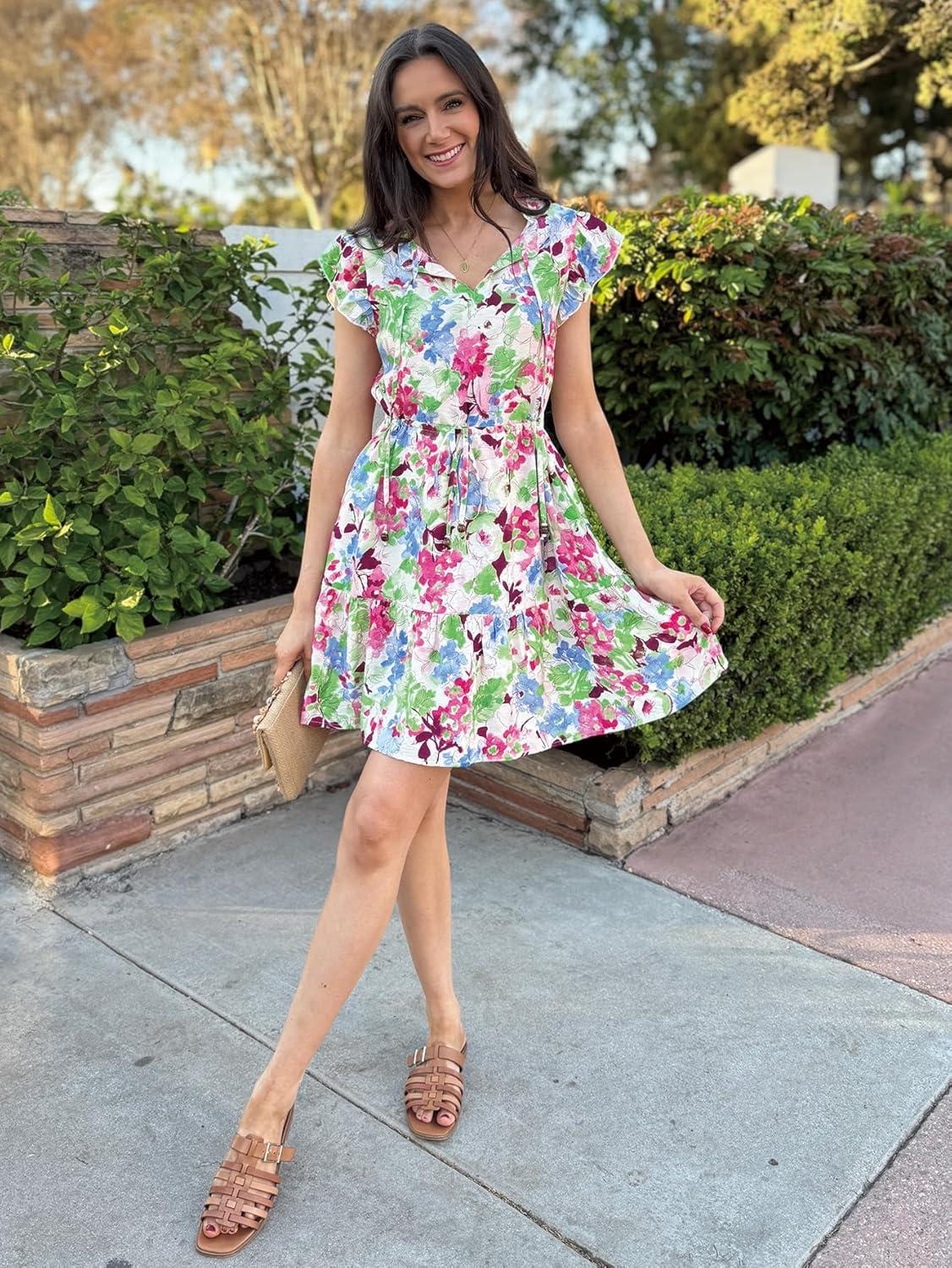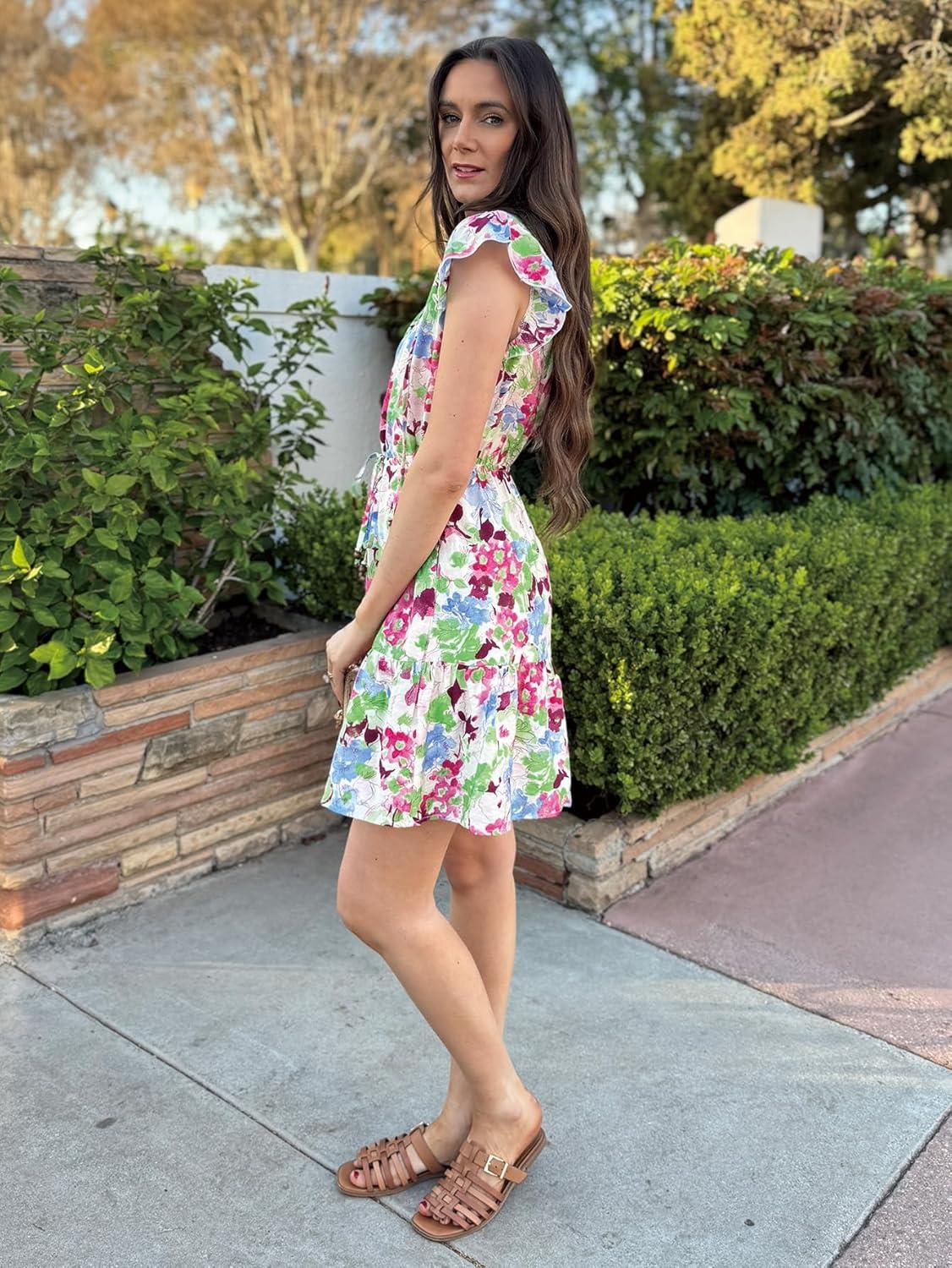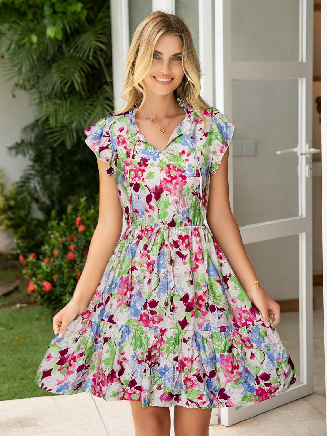 Simplee Womens Summer Dress 2025 Ruffle Short Sleeve Floral Boho Dress V Neck A-line Drawstring Mini Dress with Pockets(Sage Green)