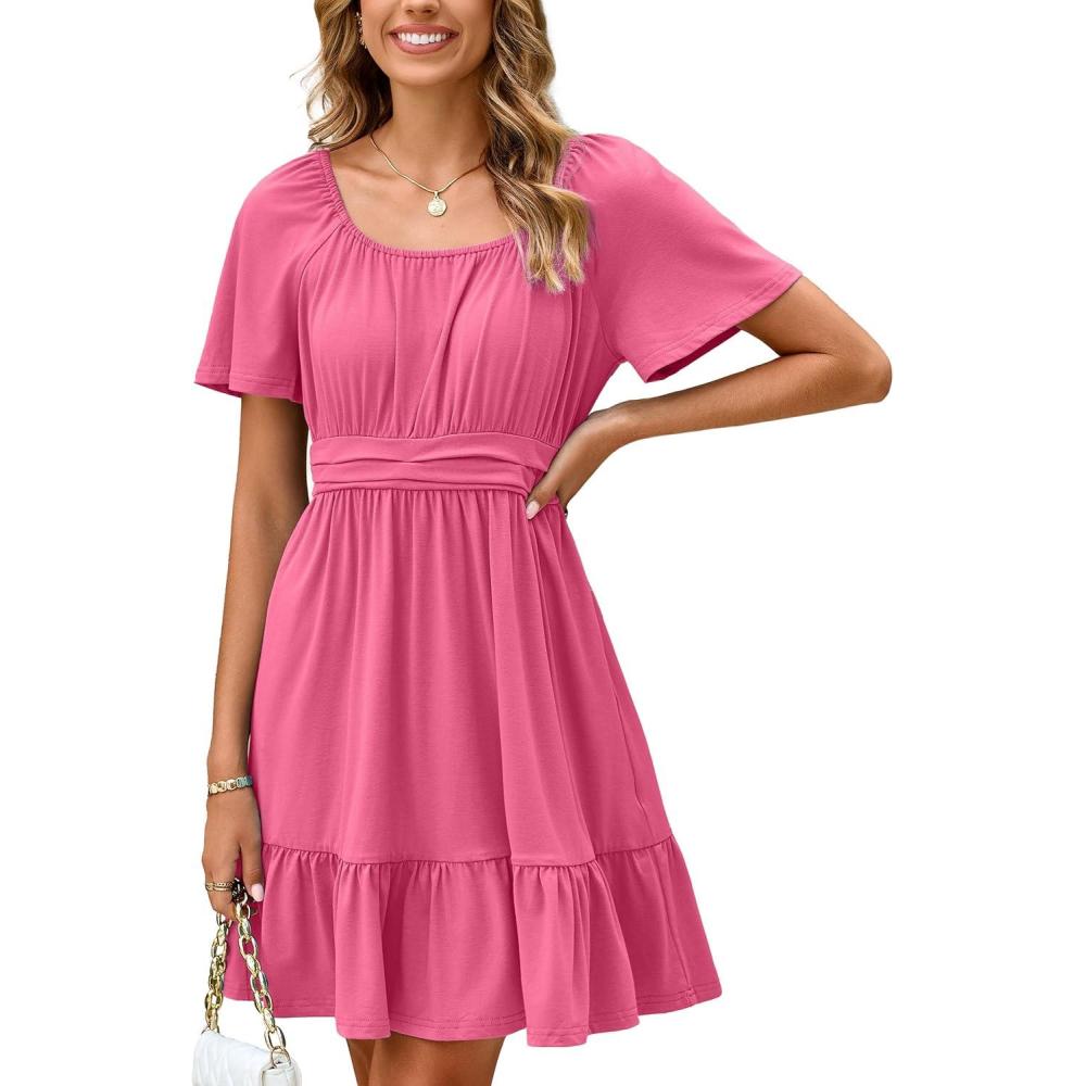 Simplee Womens Summer Dresses 2025 Mini Square Neck Casual Short Sleeve Shirred Flowy A-Line Dress with Pockets(Rose Pink)