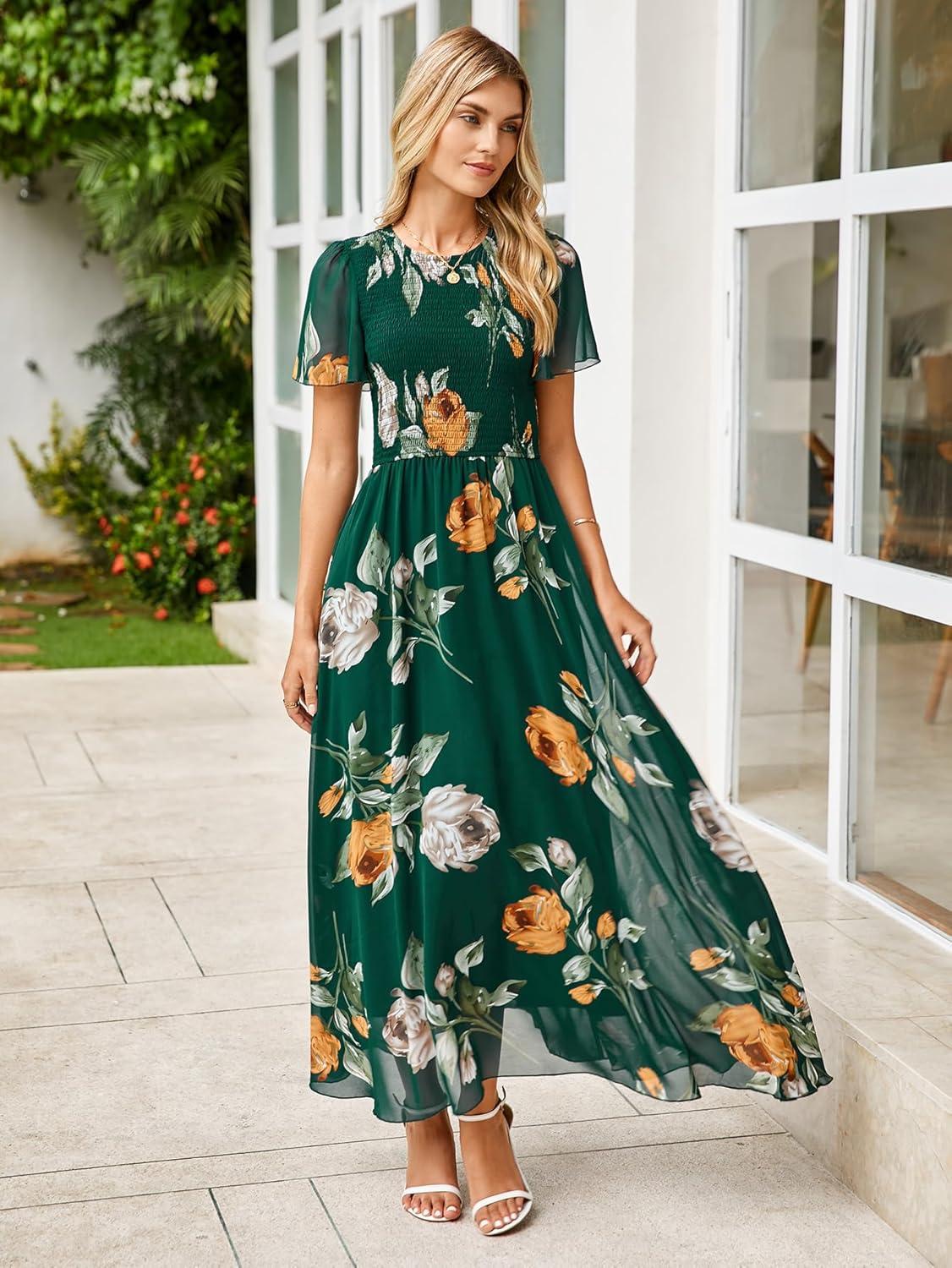 Simplee Womens Summer Floral Casual Maxi Dresses Flutter Short Sleeve Crew Neck Smocked Chiffon Boho Flowy Dress(1# Dark Green)