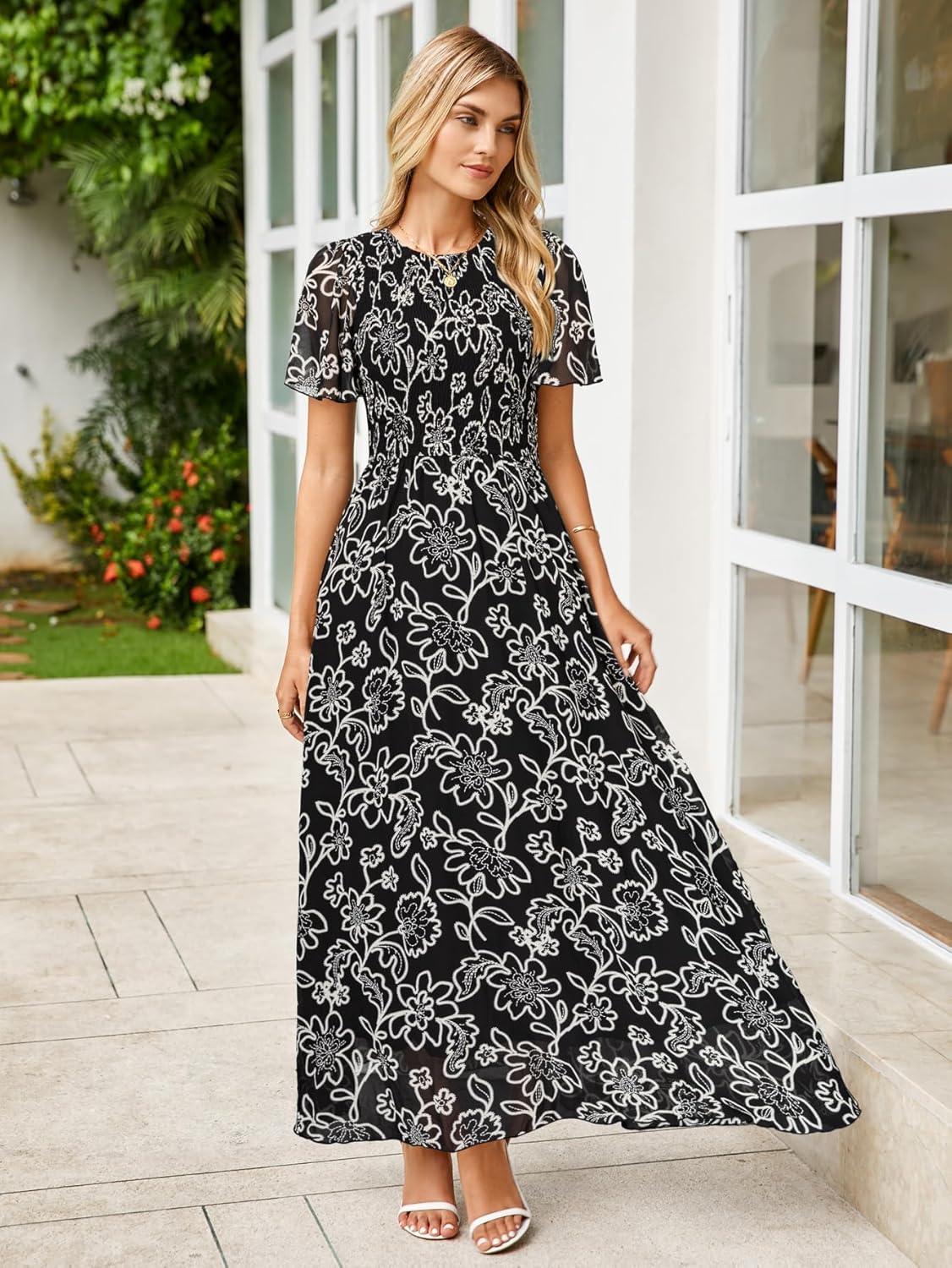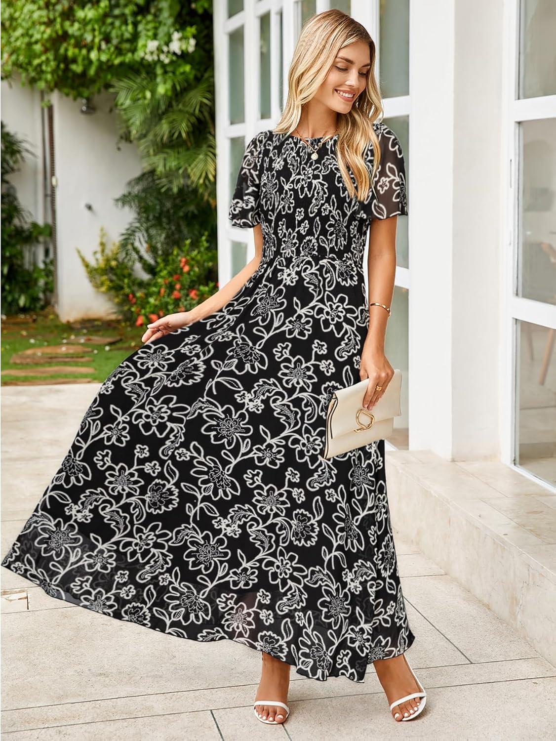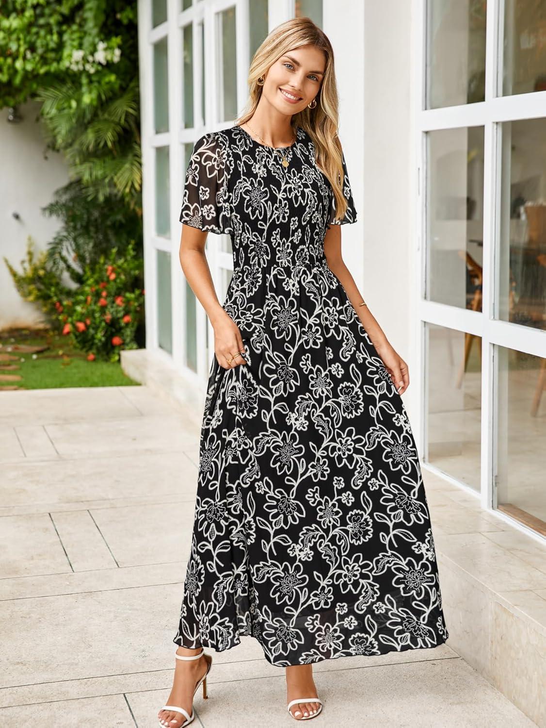 imageSimplee Womens Summer Floral Casual Maxi Dresses Flutter Short Sleeve Crew Neck Smocked Chiffon Boho Flowy DressBlack White