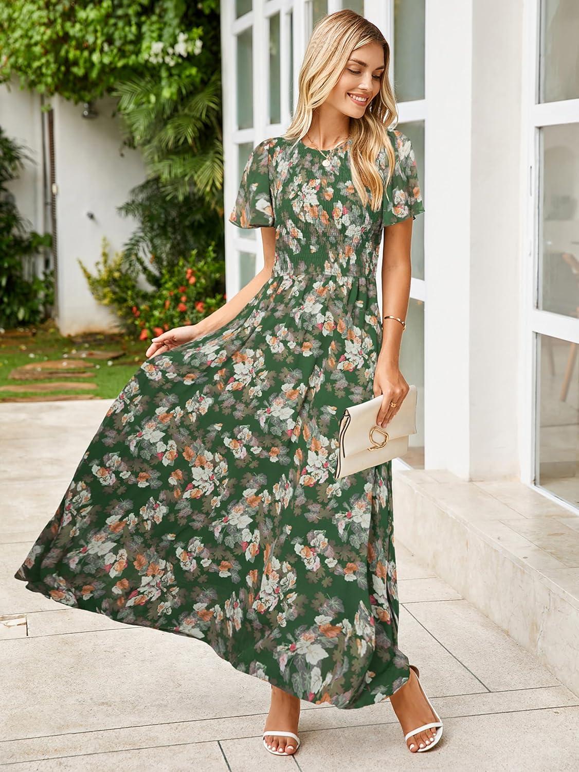 Simplee Womens Summer Floral Summer Maxi Dresses Boho Flowy Flutter Short Sleeve Crew Neck Vacation Smocked Chiffon Dress(Floral Black)