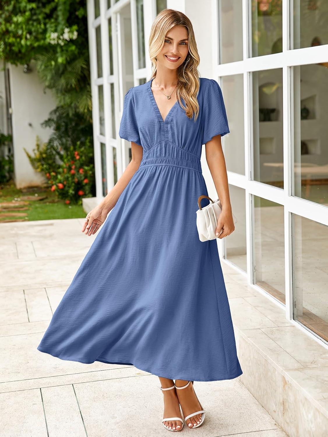 Simplee Women's Summer Flowy Midi Dress Casual V Neck Short Sleeve Empire Waist Boho Beach Wedding Guest Dresses(Blue)