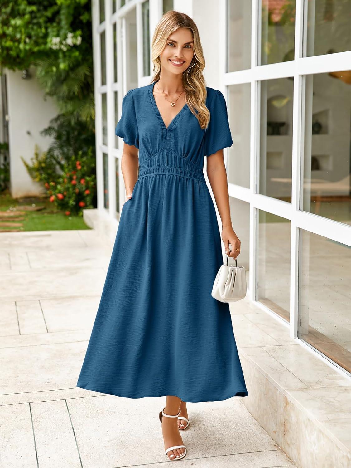 Simplee Women’s Summer Flowy Midi Dress Casual V Neck Short Sleeve Empire Waist Boho Beach Wedding Guest Dresses(Deep Blue)