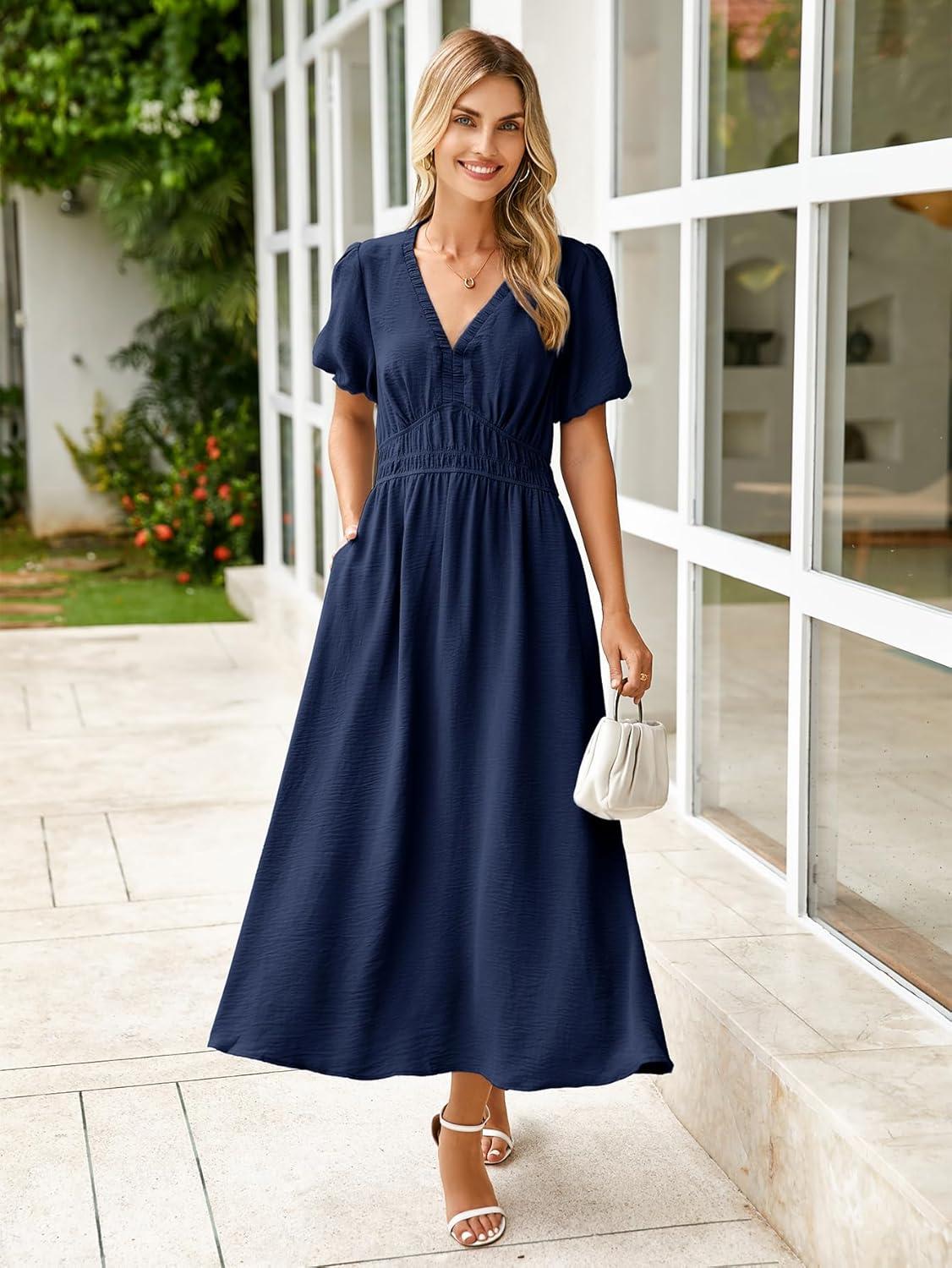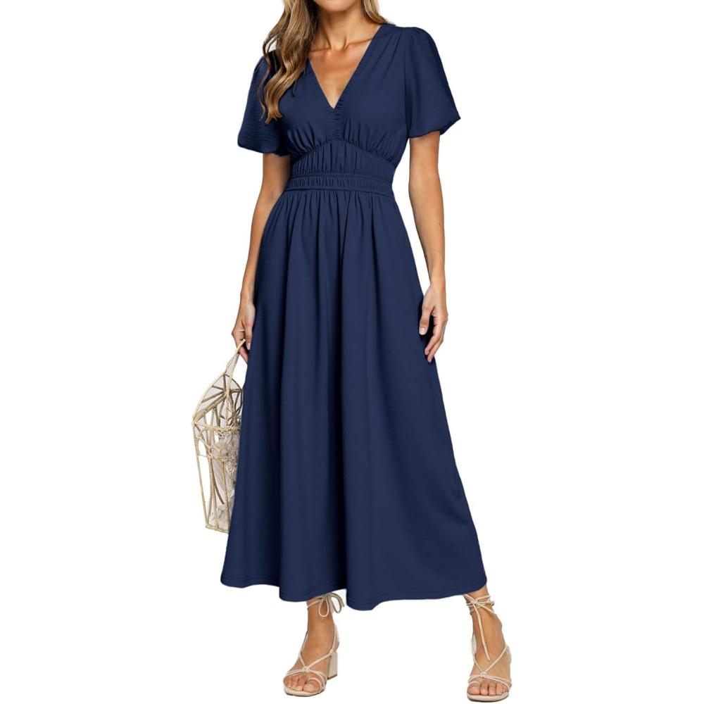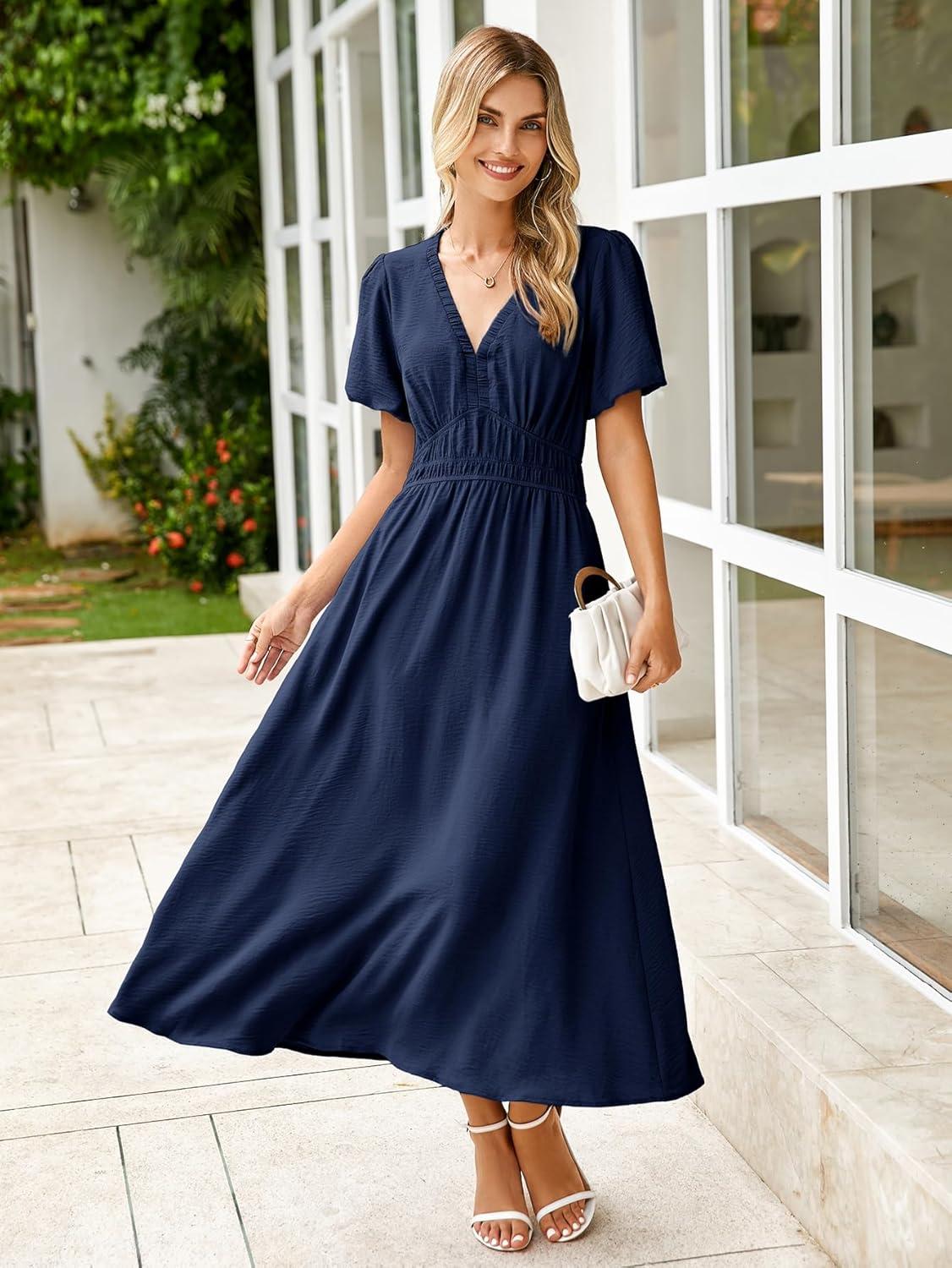 Simplee Women’s Summer Flowy Midi Dress Casual V Neck Short Sleeve Empire Waist Boho Beach Wedding Guest Dresses(Navy Blue)