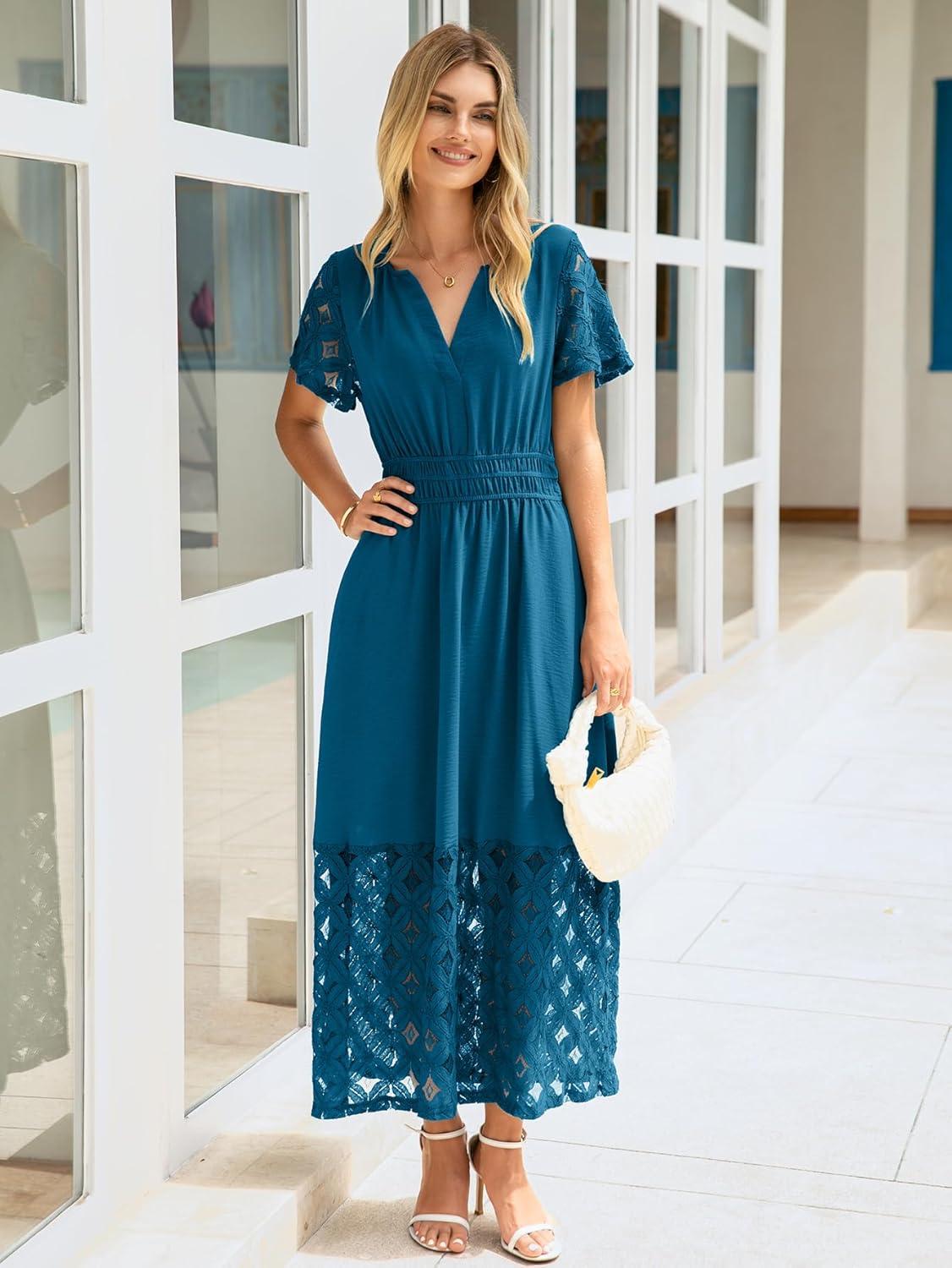 Simplee Womens Summer Maxi Dress 2026 V Neck Empire Waist Long Flowy Boho Dresses with Pockets(Ink Blue)