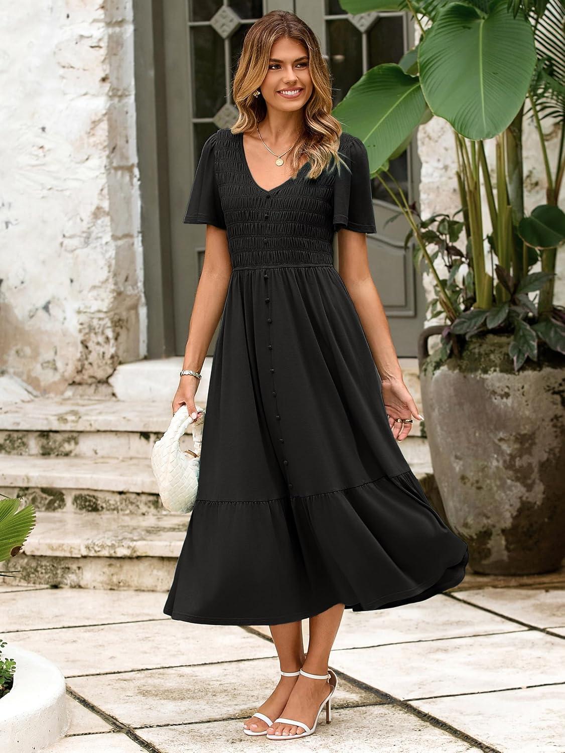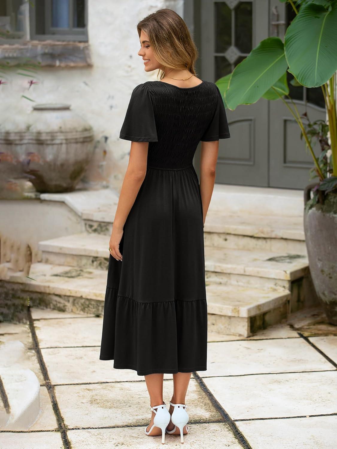 Simplee Womens Summer Smocked Flowy Dress – Casual Flutter Sleeve Tiered Boho Maxi Dresses with Pockets(Black)